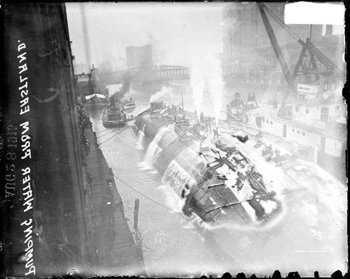 in the summer of 1915 (just three years after the titanic had capsized), the western electric company chartered four ships to transport employees and their families to an annual company picnic in the dunes of indiana. at about 6:30 am on a rainy morning, the steamships were docked along the chicago river, ready to be boarded for a jovial event arranged for 7,000 people. unfortunately, the day would quite literally take a disastrous turn, when the eastland became unbalanced and toppled over, immediately after leaving its dock near the clark street bridge. within minutes after tipping, the vessel had entombed hundreds of passengers underwater, and many more who had been thrown overboard drowned amidst the chaos, overcome by the surging current, and the weight of heavy clothing. although the eastland rested in just 20 feet of water, over 800 people were killed during the nightmarish and preventable accident which wiped out 22 entire families. the cause was controversial and litigation took decades in court, but common consensus on record is that overcrowding exacerbated an already unsteady ship. there was negligence on the part of the company for not heeding warnings or making any effort to avert calamity, instead trying to fit an unsafe number of people onboard.