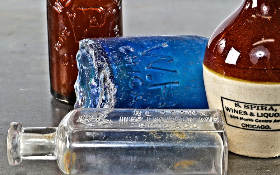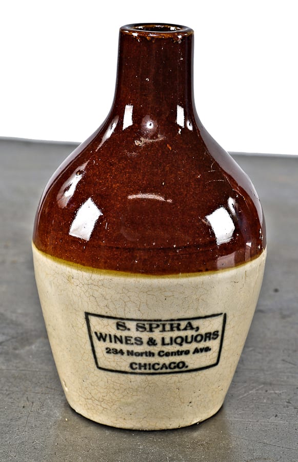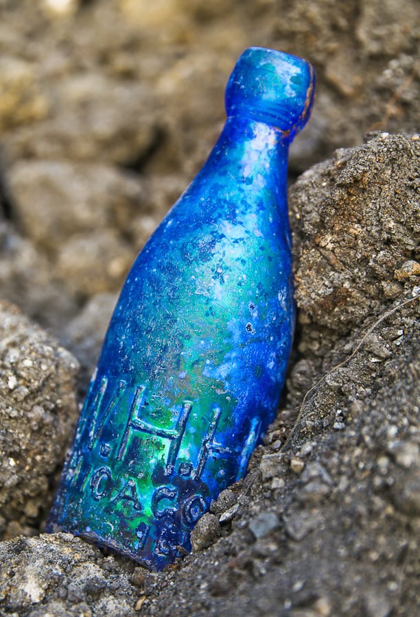 excavation of the lot where the house once stood, along with lots to the east and west, wrapped up this afternoon – the concrete footings for the condos being erected there were completed shortly thereafter. while research is ongoing, i did manage to unearth a few 19th century bottles from the lots flanking the location where the house stood. these include another w.h.h. blobtop and a diminutive two-toned glazed pottery jar stamped for a liquor store that would have been near the intersection of racine and milwaukee avenue.