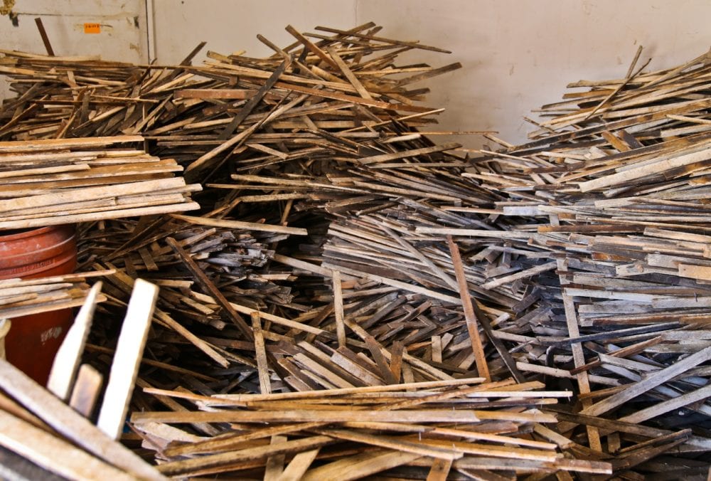 mountains of early 20th century lath waiting to be organized and strapped into bundles for reuse as anything and everything. the building is slowly dying, but its remnants will live on elsewhere.