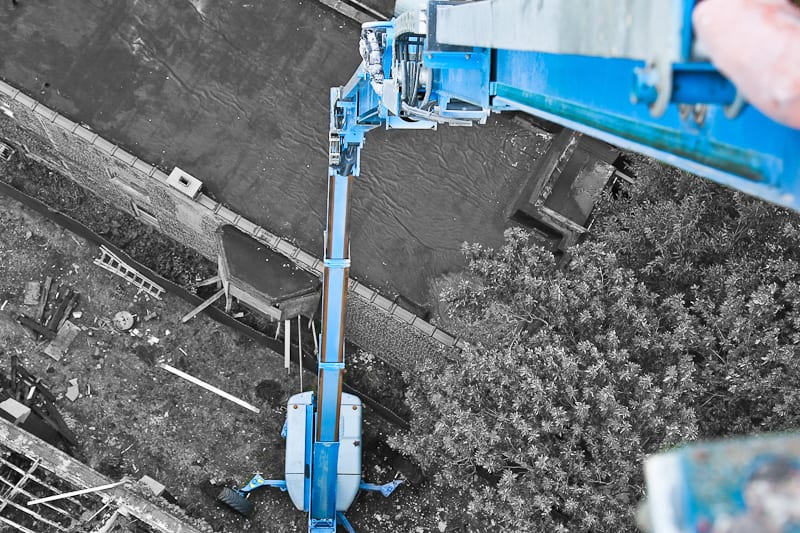 in this case, neither drone, nor “gopro” were used. instead, i approached the structure with the help of a boom lift or “cherry picker,” and with my camera and interchangeable lenses in hand to capture the structure from high above. from this unusual vantage point, high above a low-lying neighborhood, there were none of the obstructions commonly faced at ground level. the view from a wrecker’s machine provided a lush new perspective from which to observe the exposed skeletal structure of st. john’s church.