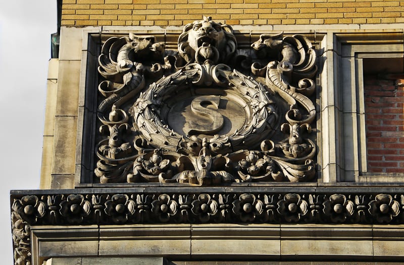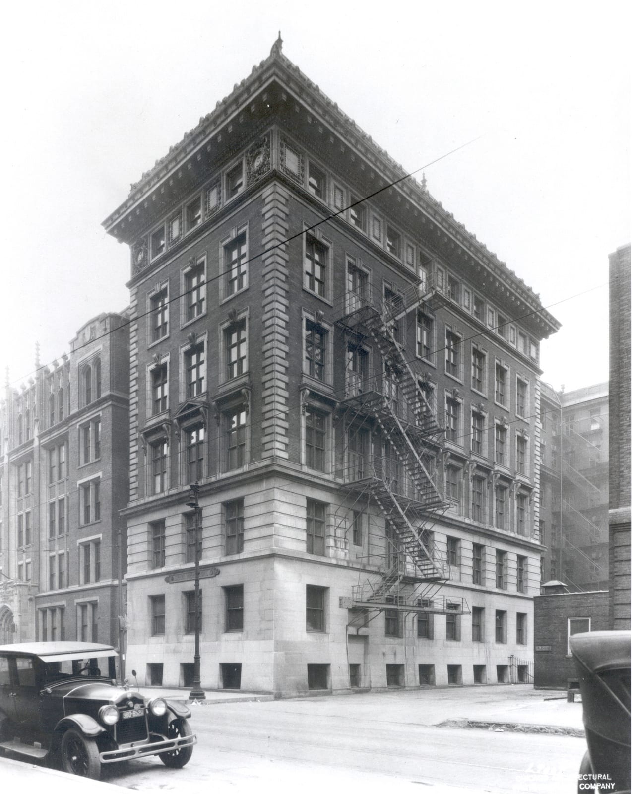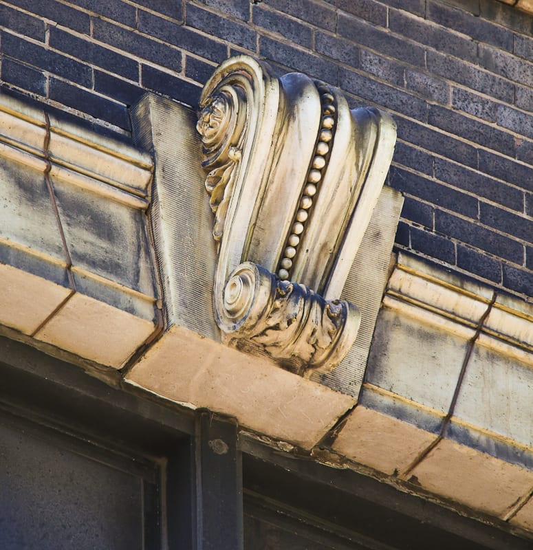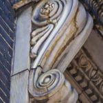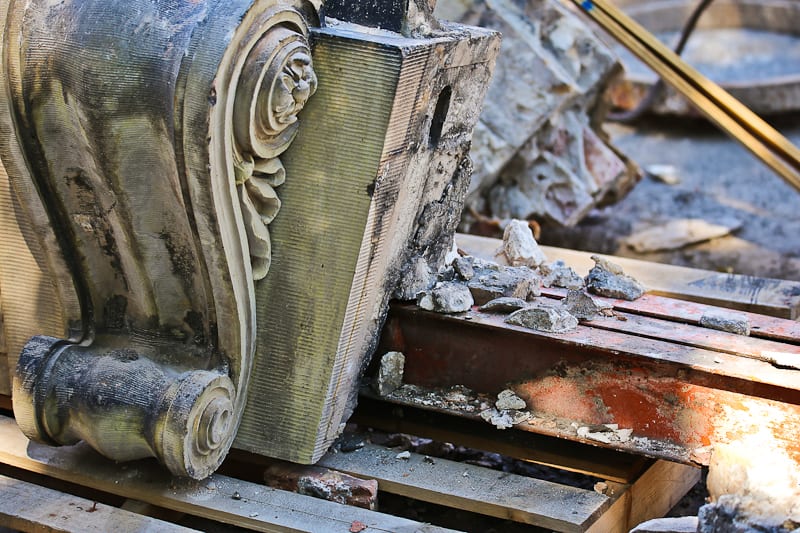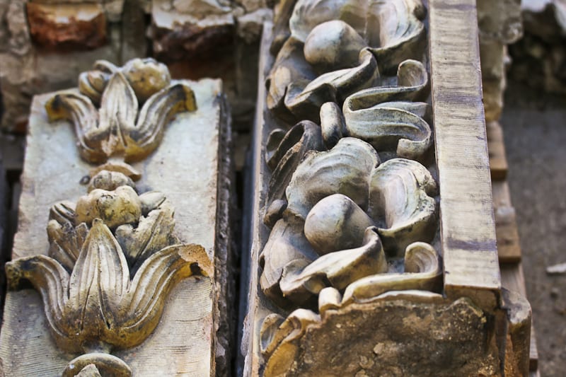 whether or not they are documenting the removal of the ornament is unknown, so i made sure to photograph the cotta ornament myself, using multiple lenses to capture as much as possible from the ground. as i surveyed the site where the neighboring buildings terra cotta ornament myself, using multiple lenses to capture as much as possible from the ground. as i surveyed the site where the neighboring buildings once stood, i did come across a few pallets of terra cotta already removed from the building’s facade. in spite of the fence in my way, i managed to photograph the salvaged pieces in detail, to later examine the manufacturer’s markings, anchoring system, cavity configuration, and surface characteristics developed over time from prolonged exposure to the elements. i suspect that the terra cotta will be palletized and later reintegrated into the hospital’s newer buildings, or otherwise will be sold off in an auction held by rush hospital.