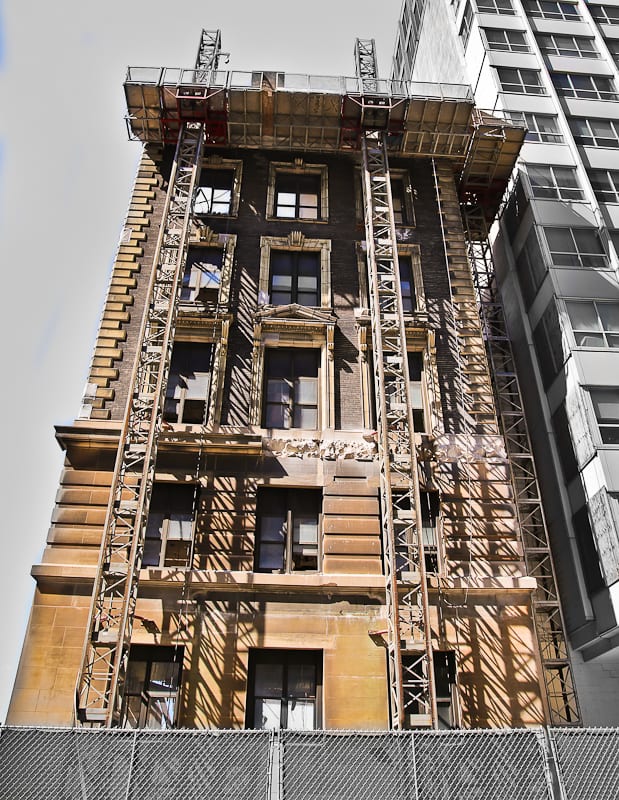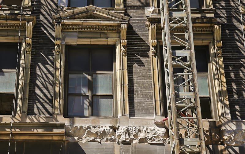 20 Aug systematic removal of senn memorial building’s ornamental terra cotta using mast climber platform