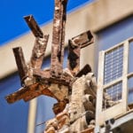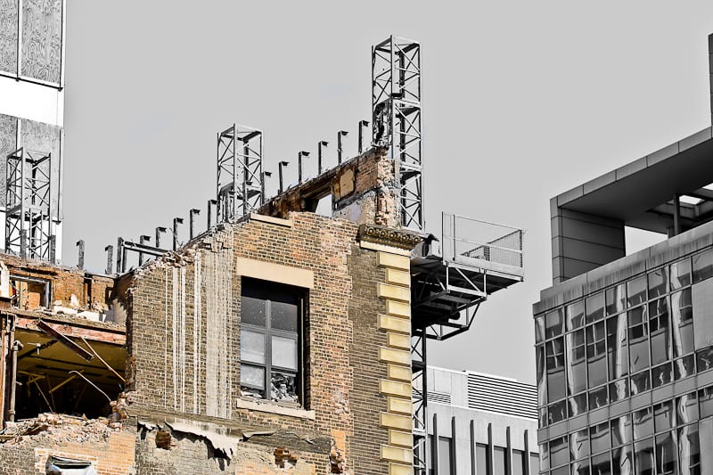 i was rather impressed that heneghan wrecking (or perhaps a subcontractor) chose to utilize advanced technology during demolition, in the form of an electric mast climber platform that ran the length of the facade. the purpose was to extract any and all neoclassical-style terra cotta ornament (possibly fabricated by midland or the northwestern terra cotta company) from the marshall and fox-designed building, from top to bottom. if a structure is to be demolished and ornament rescued, this is exactly the type of equipment and method i would embrace, since it’s essentially a spacious “workplace in the sky” where you can systemically remove the ornament and easily document the entire process through camera or video.