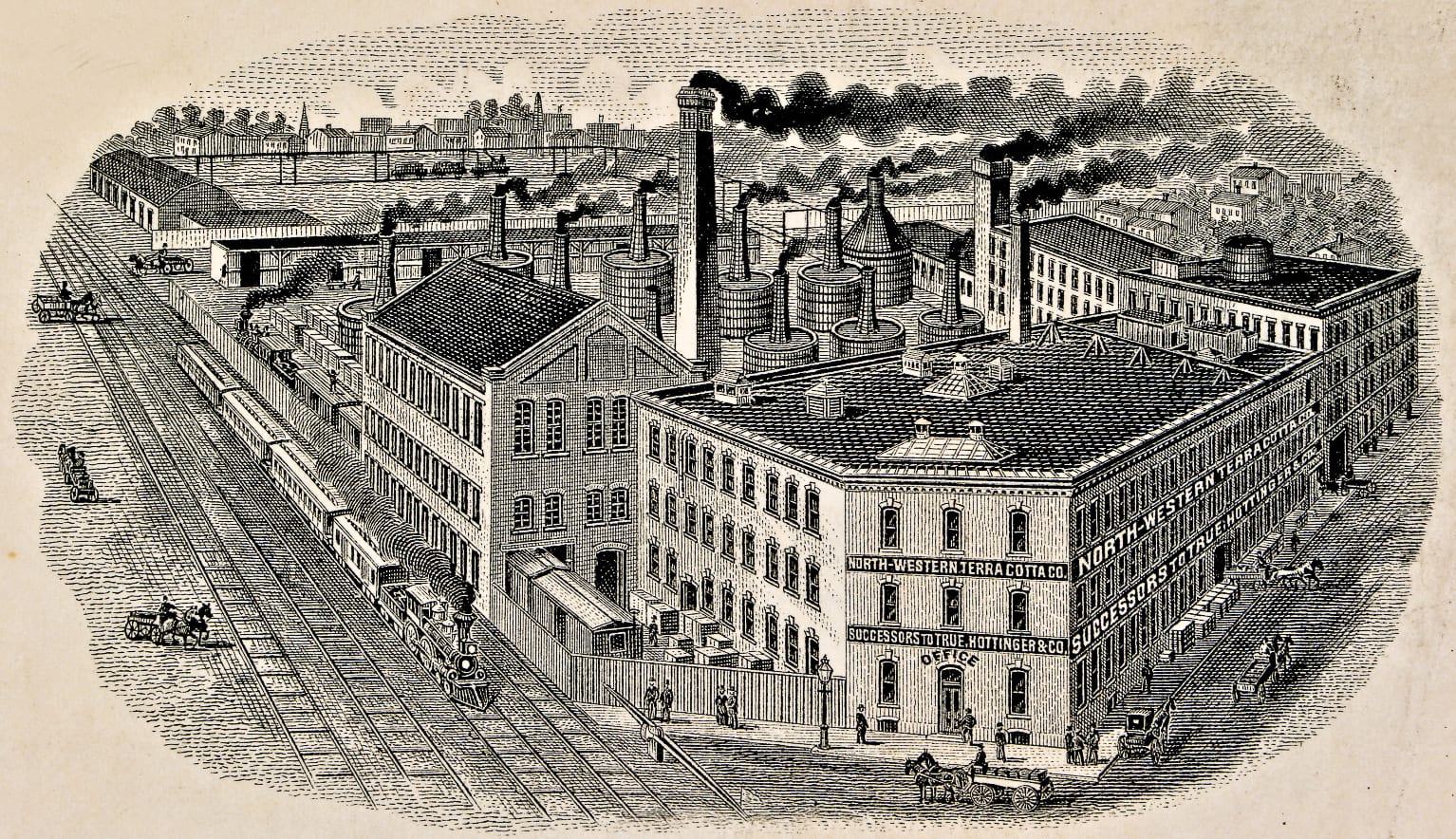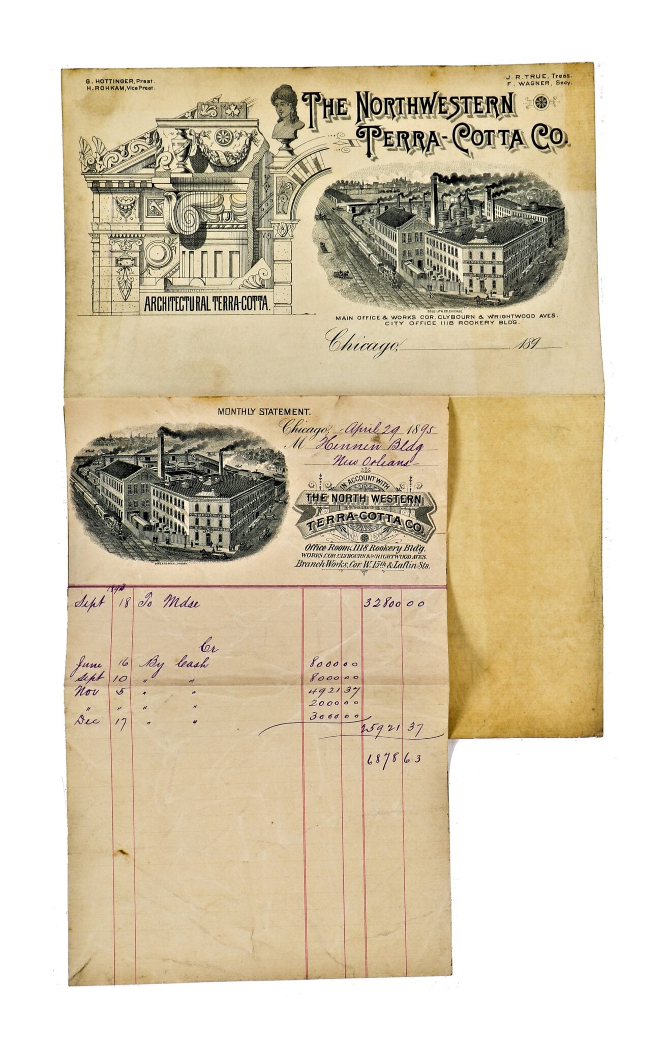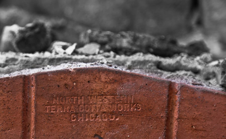 and yet, like the salvage itself, a narrative requires an exploration of process itself. this means detailing important finds (e.g., finding several business cards in the base of a newel post), demystifying the alterations that happened over time, pinpointing fabricators of materials, and so on. all of this requires a great deal of research, and thus time, which is not on my side at the moment. on this particular site, for instance, i discovered that a few pieces of exterior terra cotta ornament contained lightly incised manufacturer markings (i.e., northwestern terra cotta works), which is something i have never seen before, and when time permits i would like to find out when they were marking their terra cotta.