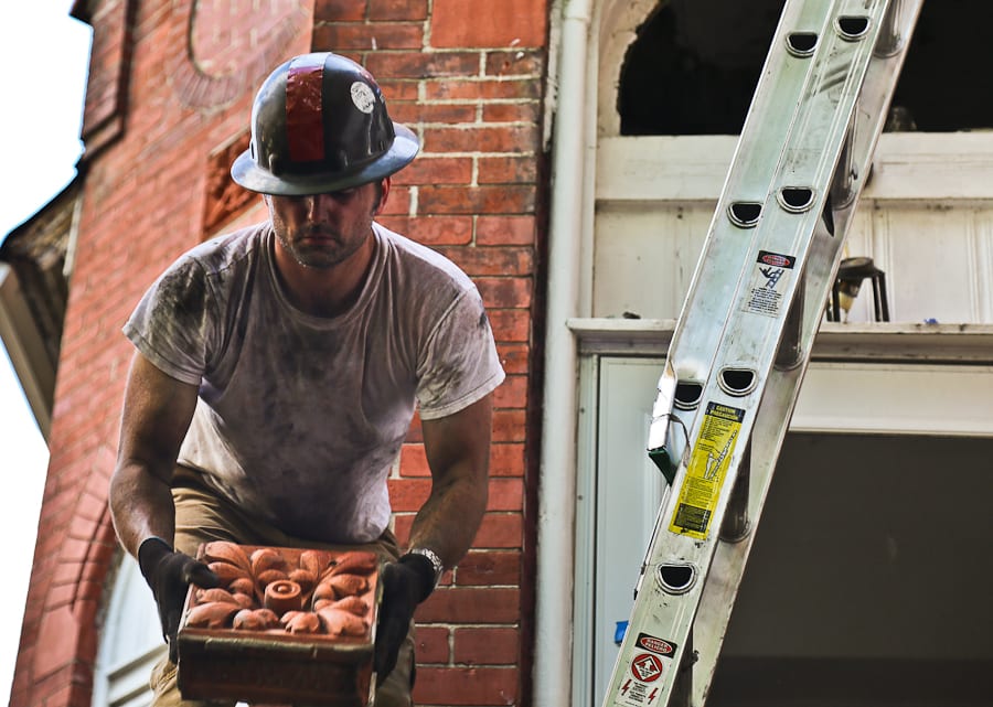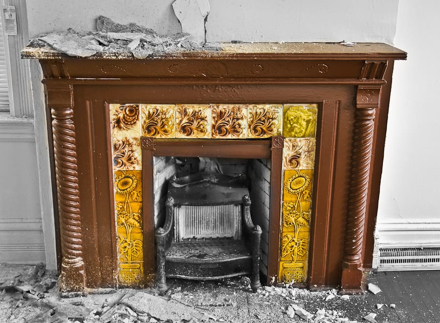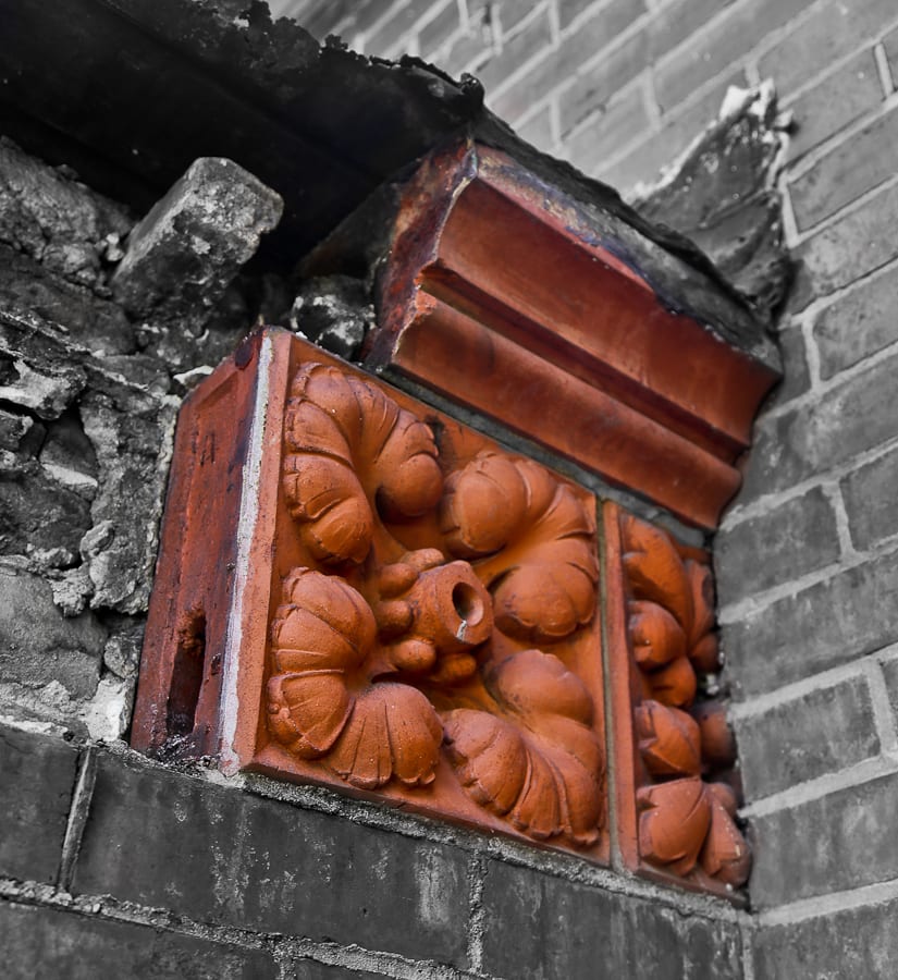 i spent at least two hours photographing the interiors and exteriors of the four structures before anything was removed, as that is one of the most important launching points for the narrative of a building’s death. from then on i extract the ornament while continuing to carefully document each phase, whether it be removal of a staircase newel post or terra cotta ornament from the roofline. i carefully  observe the “reverse engineering” process of demolition, as the building being slowly dismantled allows a glimpse of the materials, process, and original method of construction.