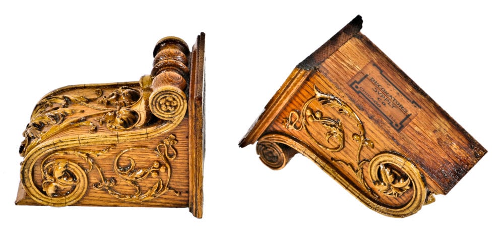 note the largely intact original manufacturer’s paper label affixed to the backside of the right corbel. i have extracted several interior residential components containing their labels while salvaging chicago homes faced with demolition.