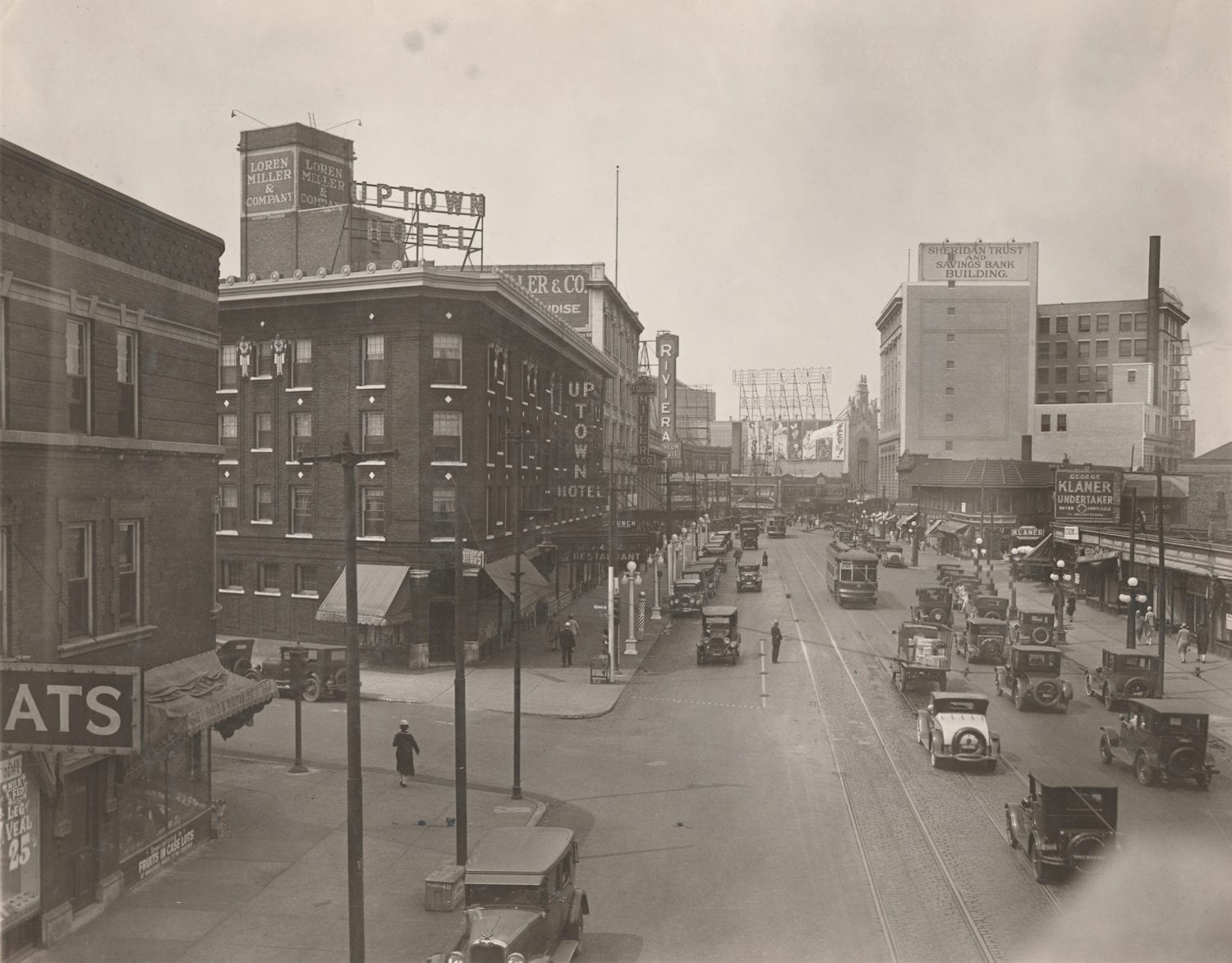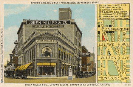 in 1931, goldblatt’s became the new occupants of the 4700-4740 block. they superseded late 19th century dry goods maven loren miller & co., whose 5 story emporium had occupied the uptown square storefront through the 1920’s. thus goldblatt’s came to inhabit the white terra cotta william klewer-designed loft building, which loren miller had enlarged by acquiring the neo-classical bank building to the north.