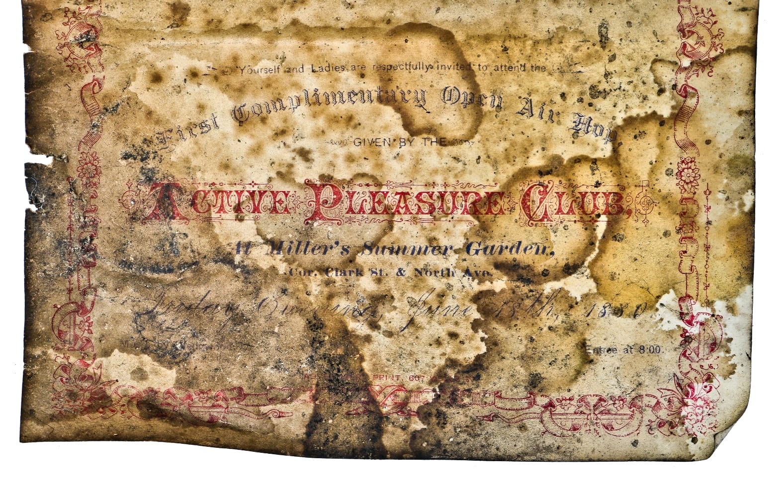 while carefully surveying and recording the deconstruction, i then thoroughly examined the cottage’s sill plates and other nooks and crannies (typically stuffed against the lath and plaster between the studs) for “insulation” or curious items left behind by former occupants that might establish a date of construction. in addition to pinning down a year the house was built, the most negligible materials often have the capacity to flesh out the lives of those long past who once called the cottage home. in this case, i managed to find a full roll of still vibrantly colored “new old stock” wall paper, several marbles, a mummified rat, newspaper fragments (dating to 1876), wood shavings left by chisels, piles of mortar and/or plaster from broken “keys” between wall lath (typically caused by exposure to climatic elements, along with the house “settling” over the years), and perhaps most interestingly, an invitation to the “pleasure club” dating to 1880.
