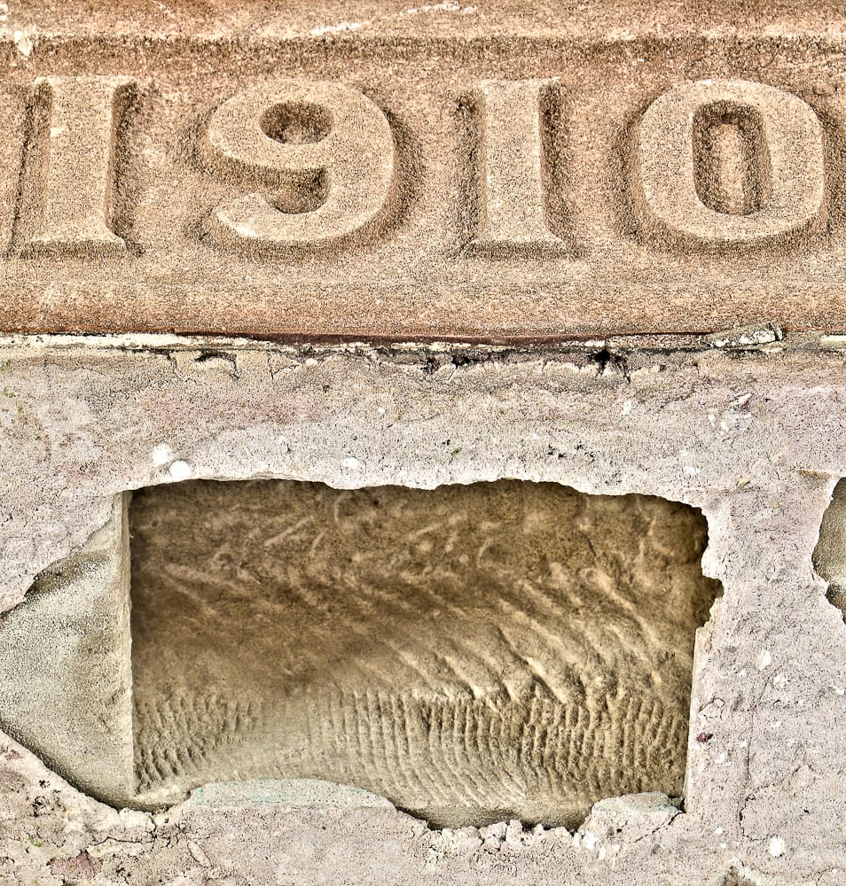 shortly after returning to my studio with st. john’s capsule and cornerstone in my possession, i at once began documenting the pressed and folded copper box or “capsule,” the dated indiana limestone block and its cavity (deeply carved into the underside of the cornerstone), and finally, the fragile contents that had been sealed away since the stone was laid in 1910.