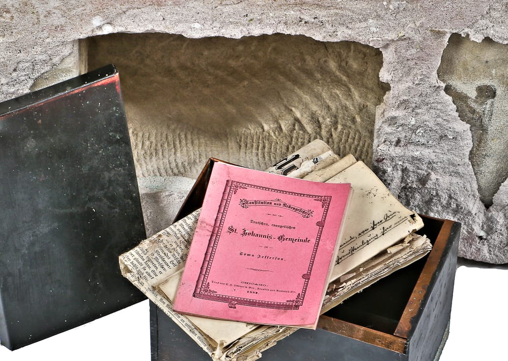 as the facade of st. john’s church came crumbling down (a terrible loss for chicago’s preservation movement) several pieces of limestone ornament, the dated cornerstone, and the copper time capsule found within it, were carefully removed. they are currently being documented in my studio, where there are already hundreds of photos to edit and several hours-worth of research required. i hope to identify the stone fabricator, church builder, and most importantly, decode the two-page, hand-written letter (written in german) that explains the origins of this chicago-based congregation, along with the details of their building which was constructed in 1910 and demolished just this week.