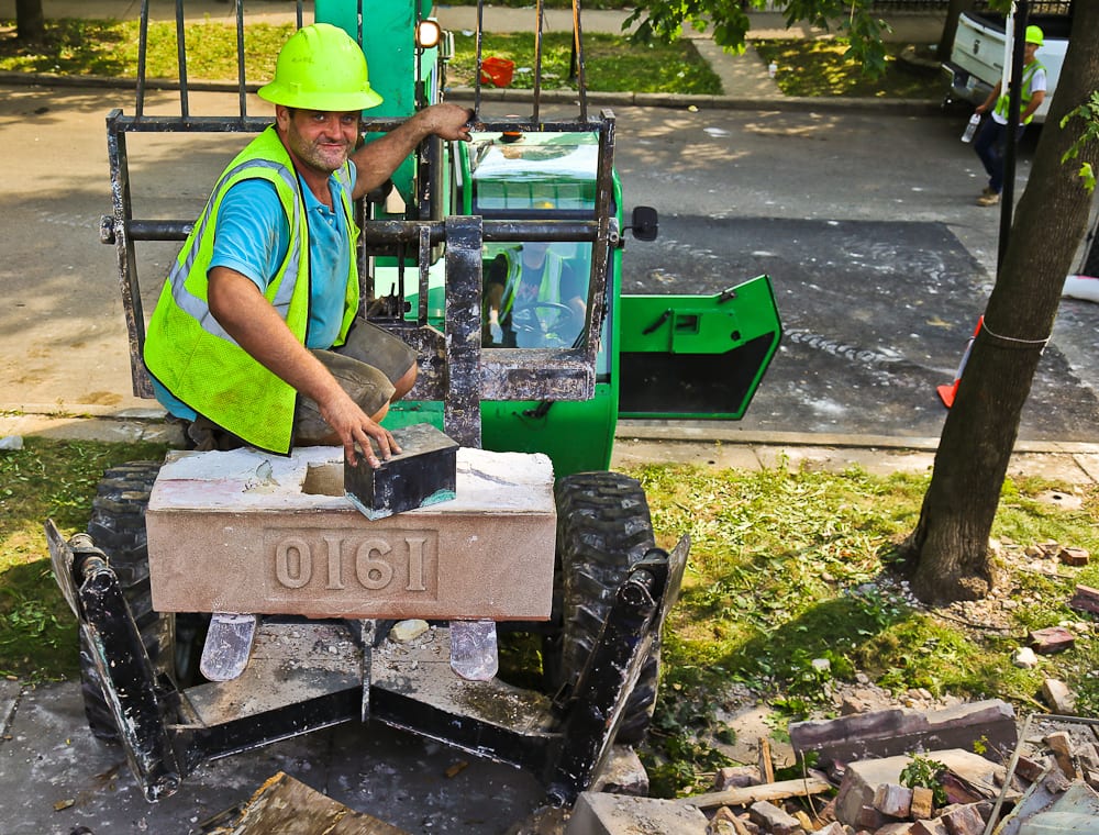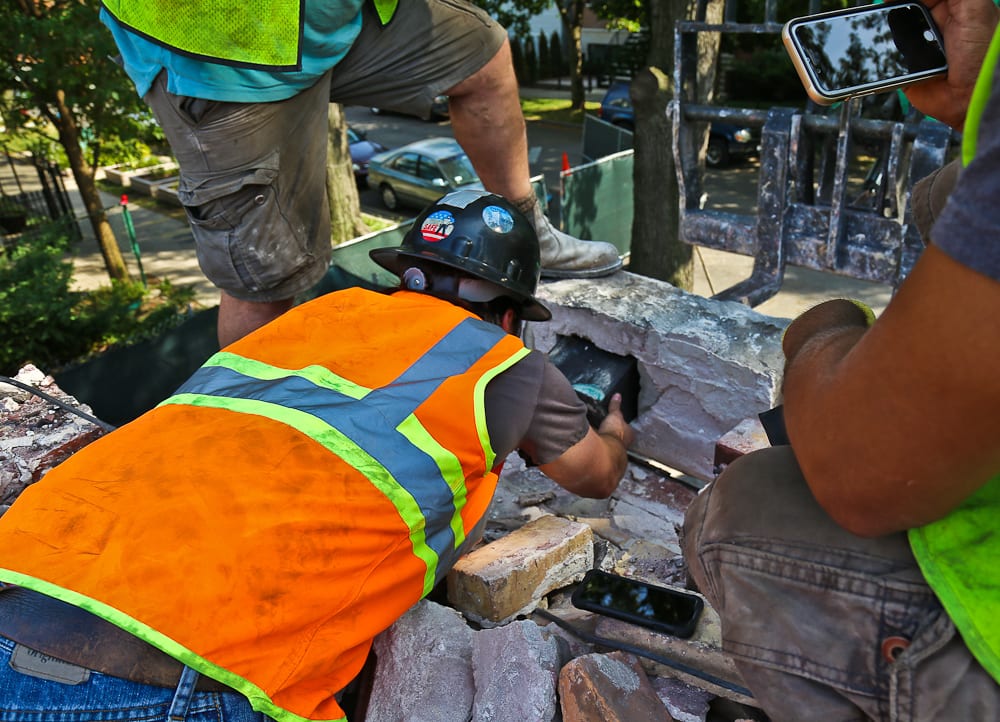 the following photo essay offers a glimpse of the capsule’s successful removal, where it was extracted from deep within the rectangular-shaped indiana limestone cornerstone. once removed, the 10 x 6 inch pressed and folded copper box was opened and the contents revealed. it was a long and stressful day, but the entire team onsite worked wonderfully together to secure the building’s remaining ornament and the church’s capsule during its fast-paced demolition. additional images of the ornament, its removal, and so on, will be included in a future post, as time permits.