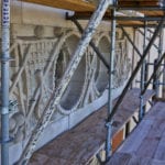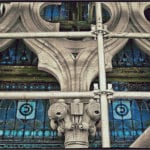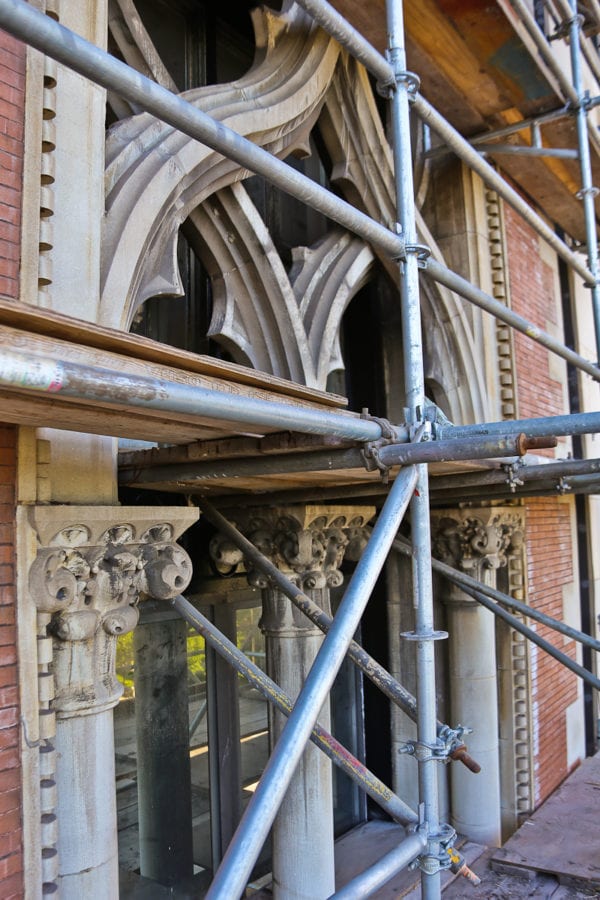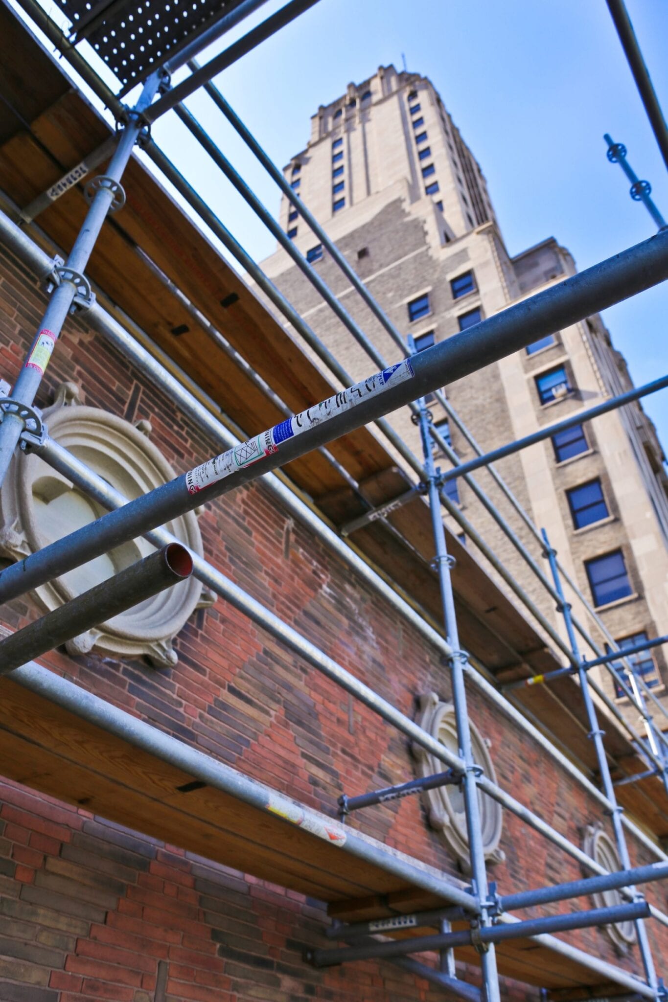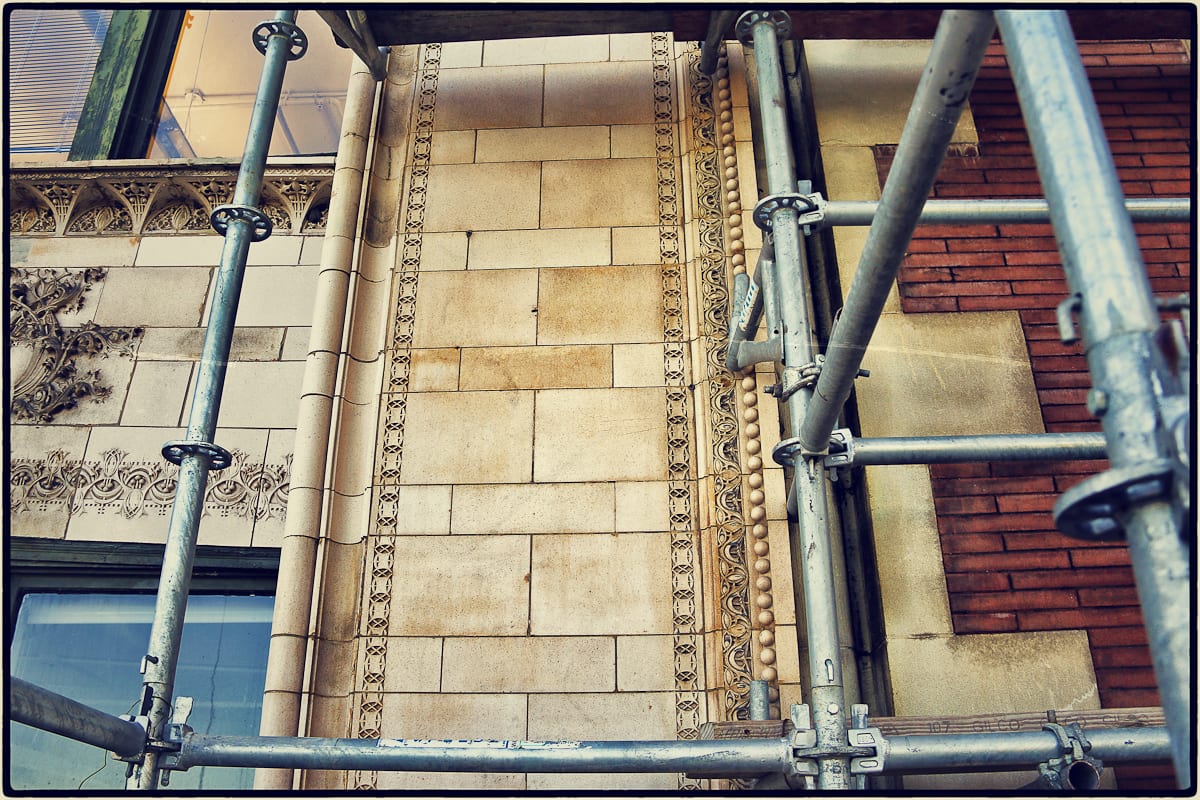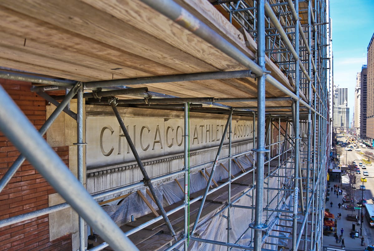 before this post, the last time the chicago athletic association building’s facade was a topic of discussion (i.e., warranting a blog post with text and images) was during the building’s transformation into a boutique hotel. i provided a few photographs at that time, but quickly moved on to other concurrent issues happening at the cac. to this day i’m not sure if anyone else documented the building’s face in such a systemic fashion, covering each and every brick, limestone ornament, art glass, alteration, and so on. at the time i made sure to photograph everything – from one end of the building to the other, walking across the planks, down the stairs, and repeating the process until i was either at the rooftop or where the scaffolding terminated.