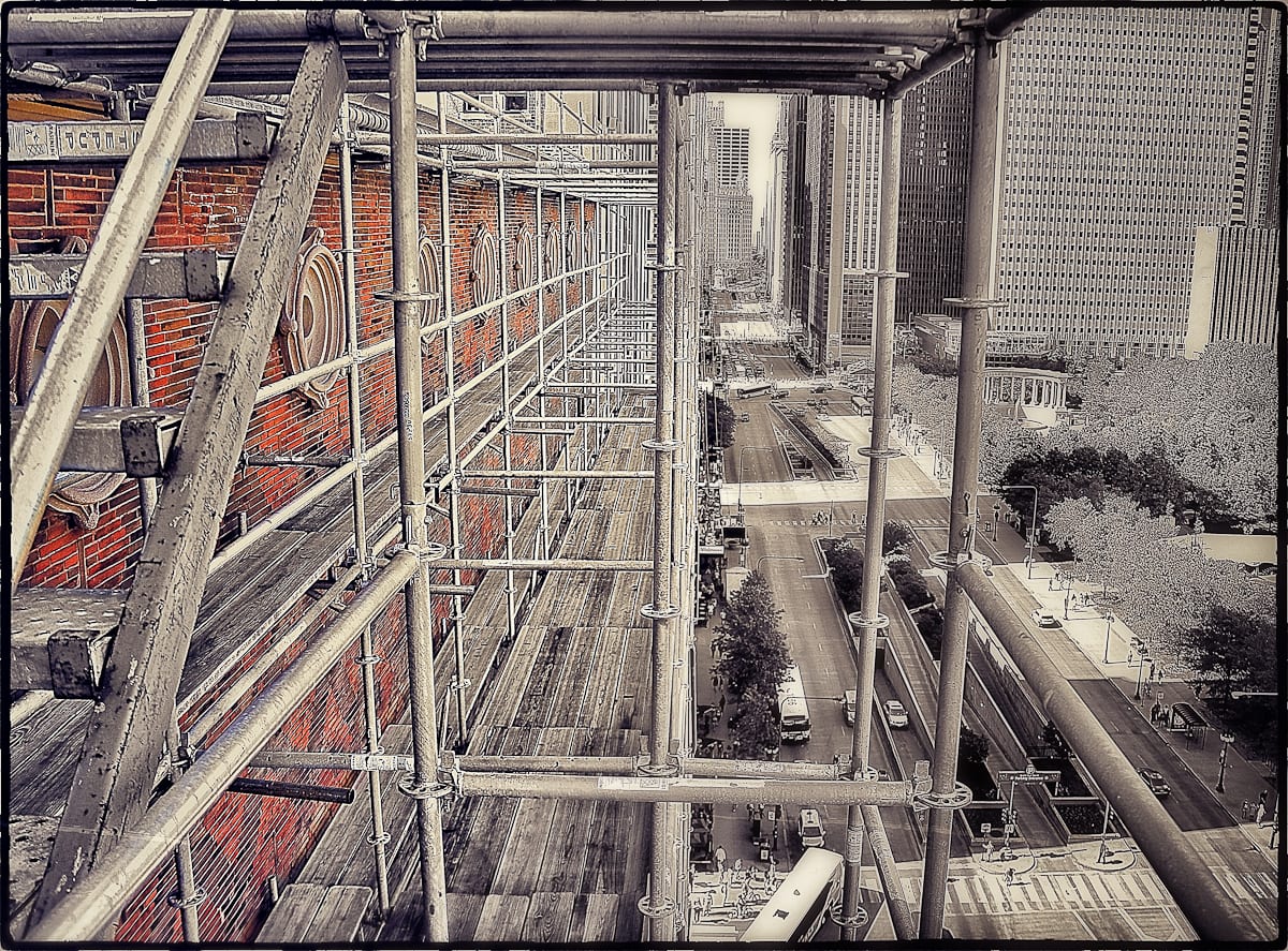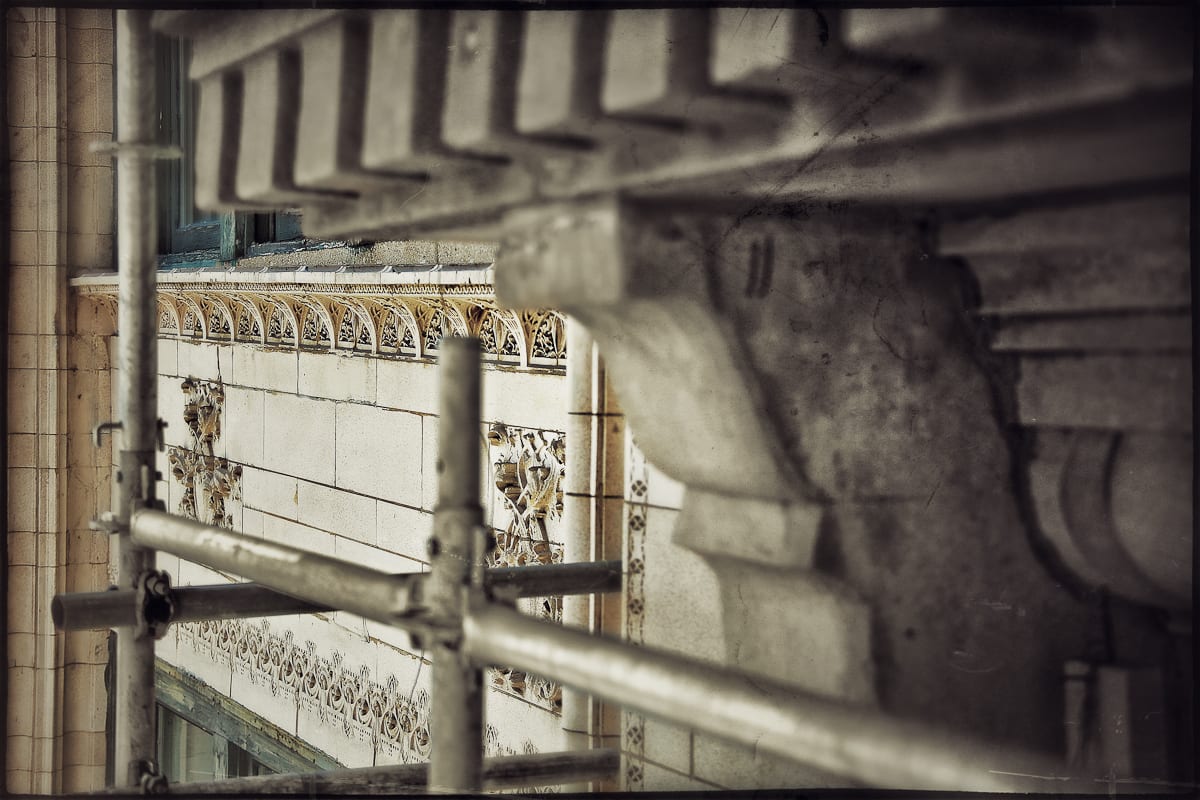 in addition, i spent an hour or so photographing the neighboring sullivan-designed gage building from that unique vantage point. i also managed to capture contrasting shots of where the two building were essentially joined at the hip. once i completely edit any and all images, which will cumulatively recreate the entire facade and parts of the gage building, i intend to “package” them up and offer the collection to architectural historians and/or researchers, building materials specialists, architects, and any others who would express interest in this remarkable building. from there i intend to go back to the interior and do the same – bundle completed images representing the grand rooms and their magnificent architectural details, which were all painstakingly restored or replicated during the building’s rebirth as a boutique hotel.