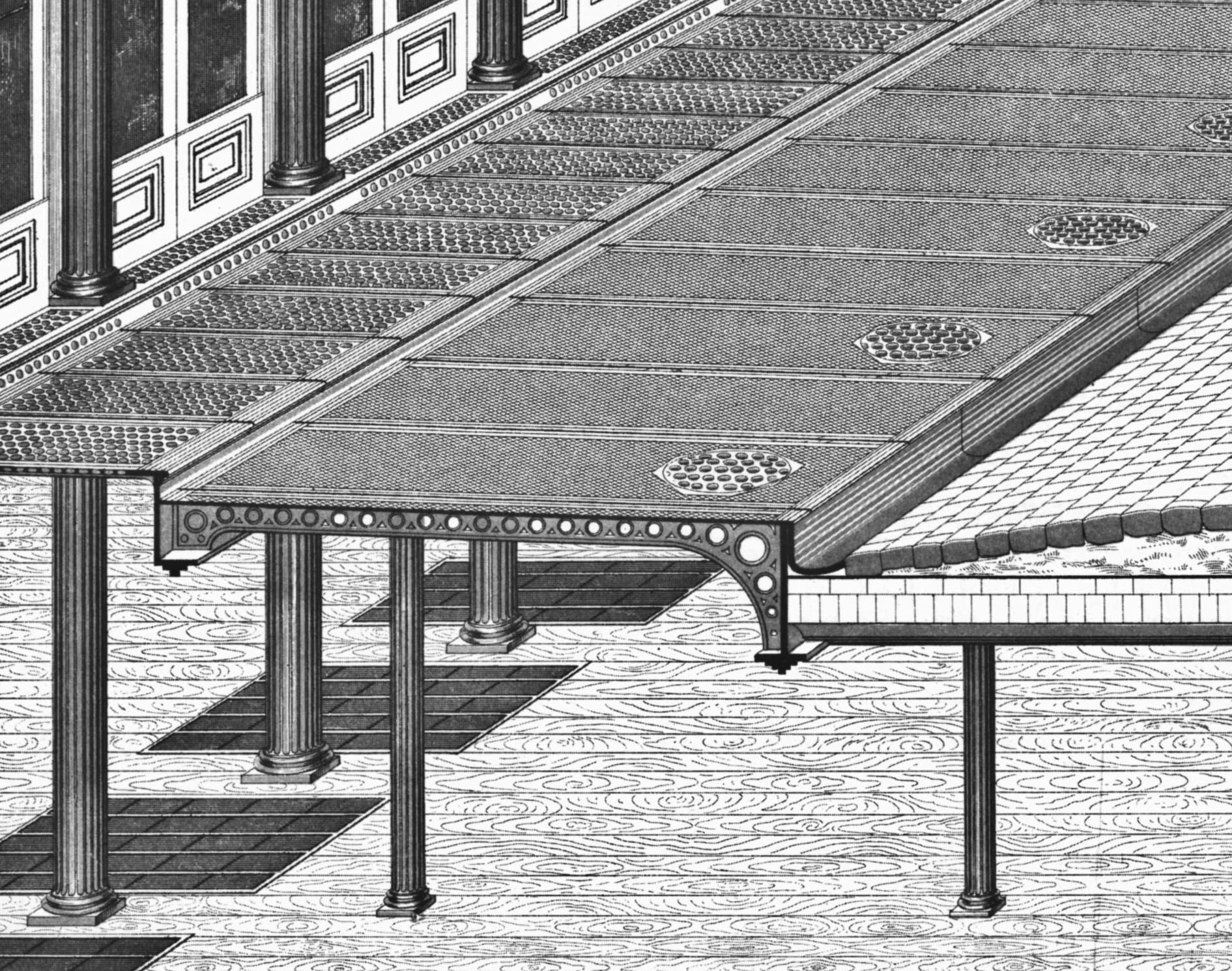 the metal lent soho’s structures many qualities- fire resistance, height, thinner walls and bigger windows. cast iron allowed for quick production of iron units and ornament which would have been considerably more expensive executed in stone. in tandem, the architecture incorporated glass bricks and vault lighting meant to penetrate into the inner reaches of the building. before the introduction of electricity, basement factories and hollow areas beneath the sidewalk were illuminated by this feature of urban architecture, which utilized thaddeus hyatt’s 1845 patent of fitted, clear glass lenses set within cast iron panels.