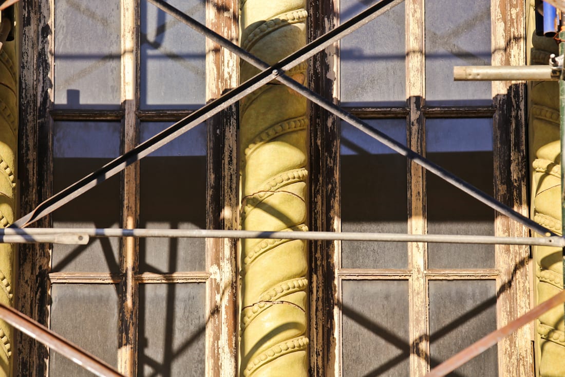 challenges of capturing congress theater’s cream-colored terra cotta ornament covered in scaffolding