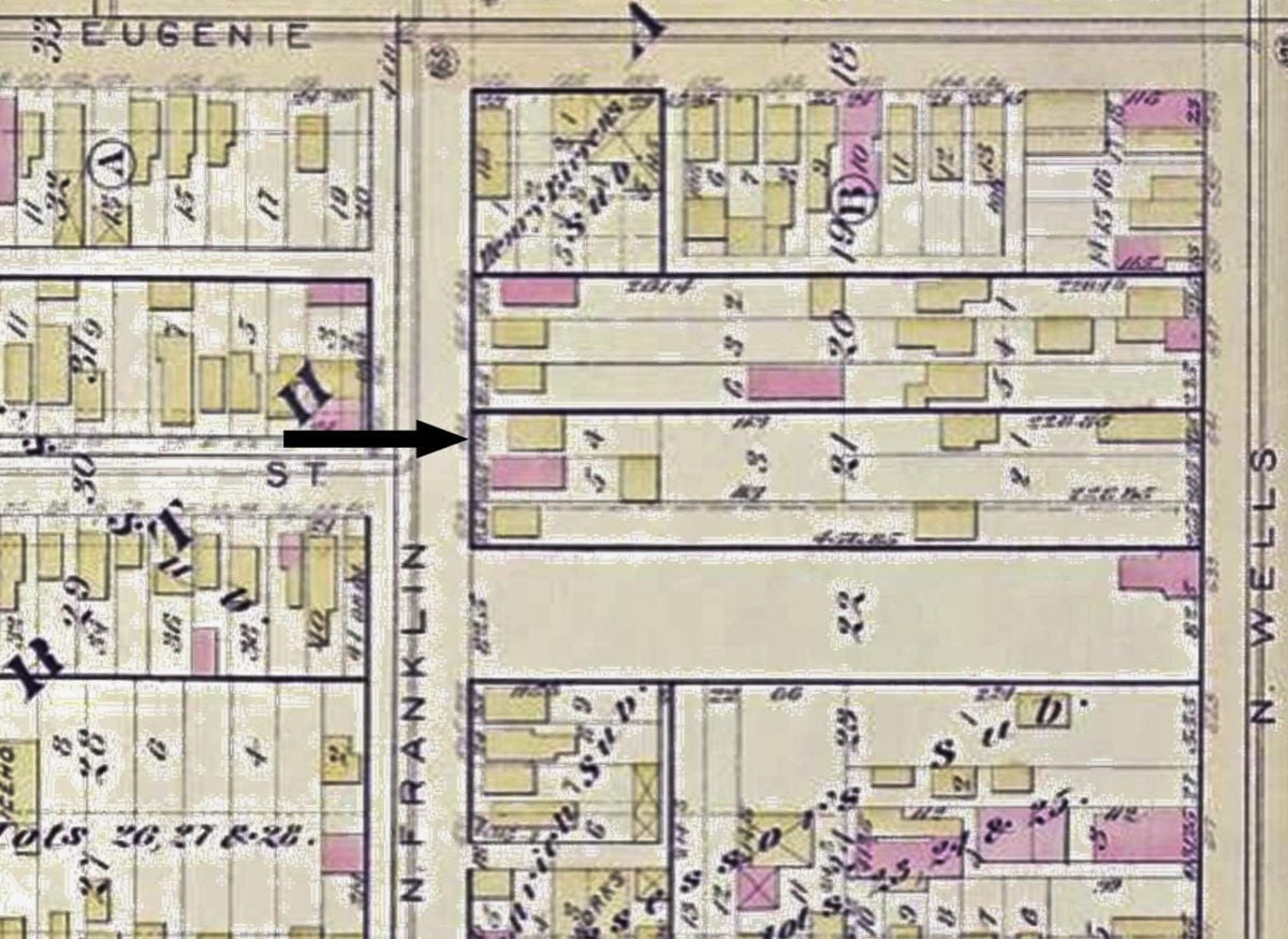 before heading off to bed, i spent about 20 minutes to do a little research on the cottage through sanborn insurance maps and city directories. the cottage and surrounding structures are found in the image of an 1886 sanborn (see below – note: the black arrow points to the cottage as it existed in 1886). according to the 1876 lakeside directory, christopher bettker resided there. his occupation is listed as “drayman,” which is a person who delivers beer for a brewery. if time permits, i will look at additional city directories, maps, newspaper articles, and so on to see if i can dredge up any additional information on a post-fire cottage the city finally gave a shit about.
