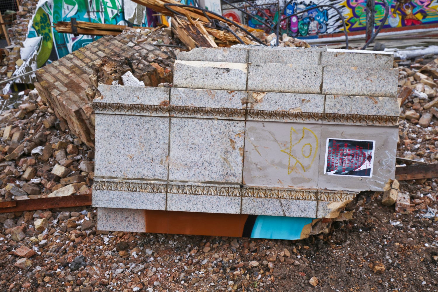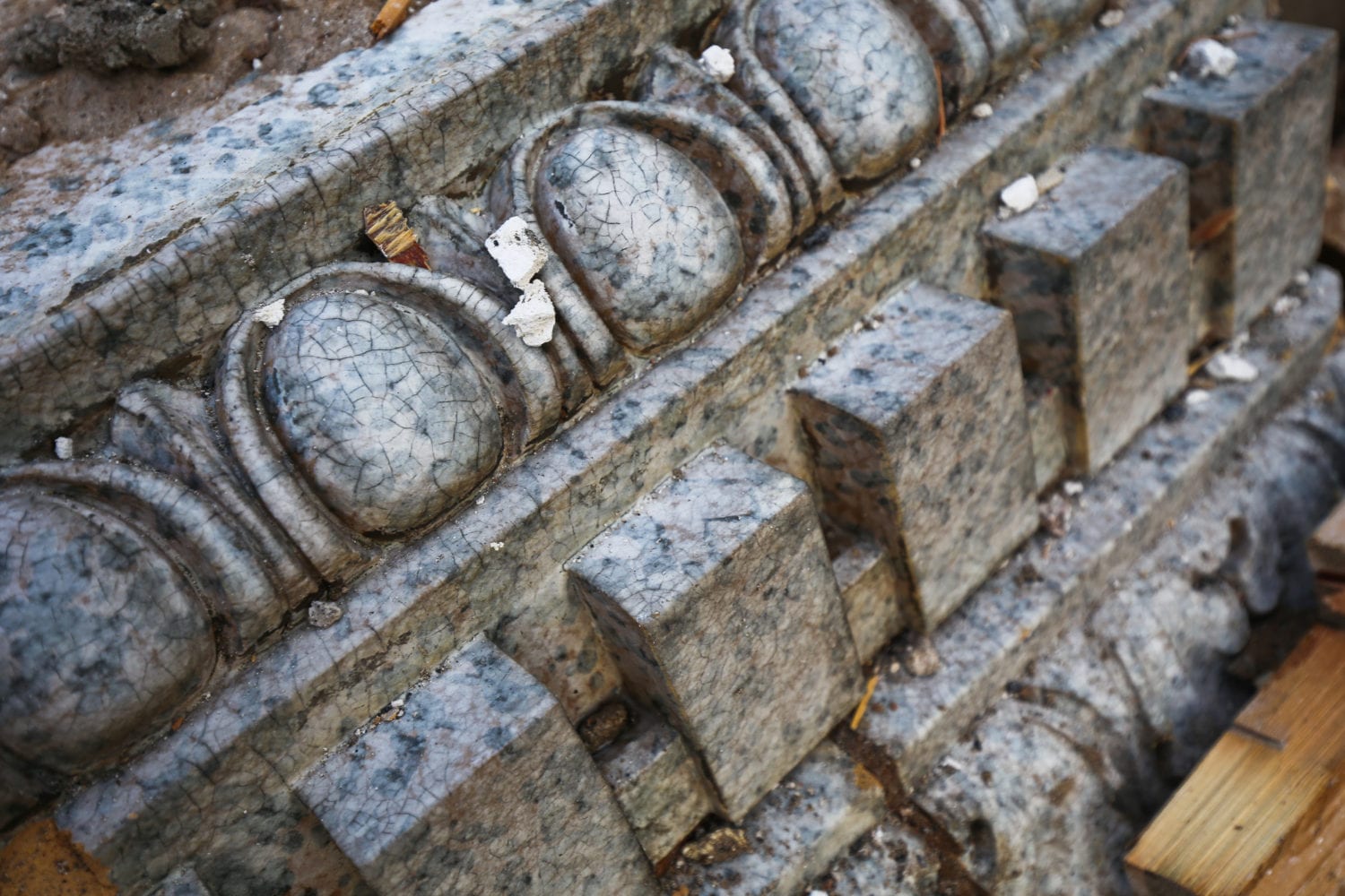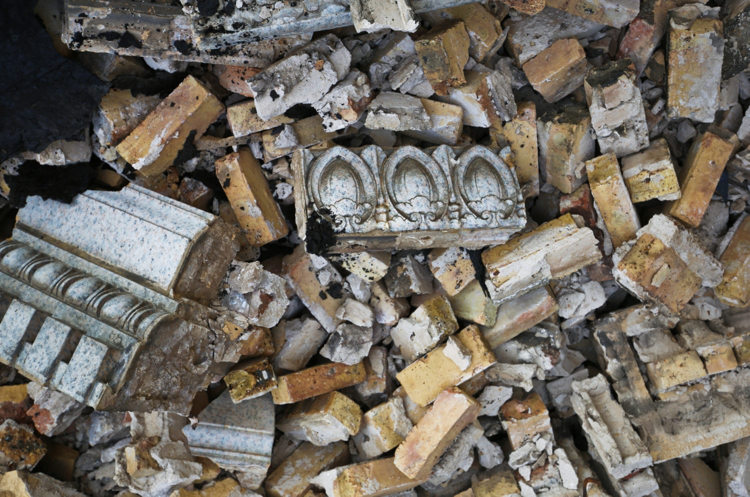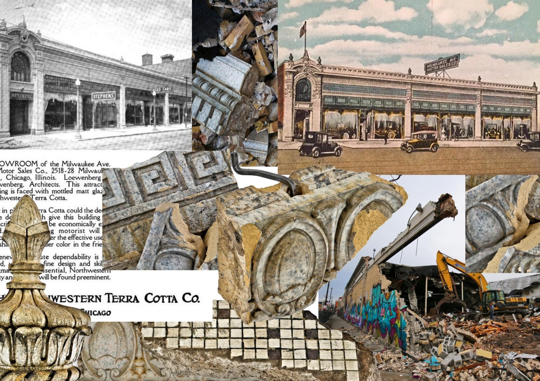 a blog entry posted two weeks ago provided extensive documentation pertaining to the careful extraction of the former milwaukee avenue motor sales building’s (more commonly known as the “mega mall”) roofline ornamental terra cotta urns. beginning last last week, demolition was underway – to my great surprise and disappointment. by the time we arrived on the jobsite, a good portion of the facade containing ornament terra cotta had been pulled down. at that point, and going forward (for the time-being) we are stuck in a search and recover operation, pulling terra cotta ornament from the rubble.