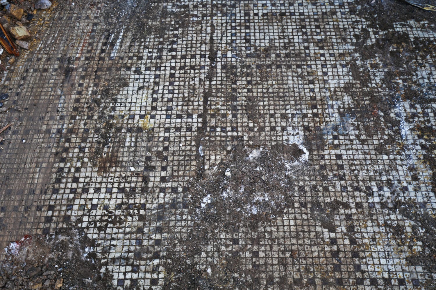 the mottled polychromatic terra cotta with a distinctive gray and lavender slip glaze (fabricated by the northwestern terra cotta company) was used extensively above the showroom windows and around the grand arch entrance. the interior originally contained three automobile showrooms with each containing 20-foot ornamental plaster ceilings and circassian walnut balconies in the rear. the brown and white tile floor with a strongly geometric pattern was discovered during demolition. a fragment of the floor was saved for future study.