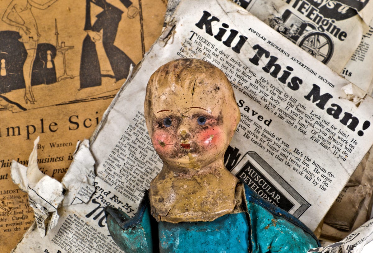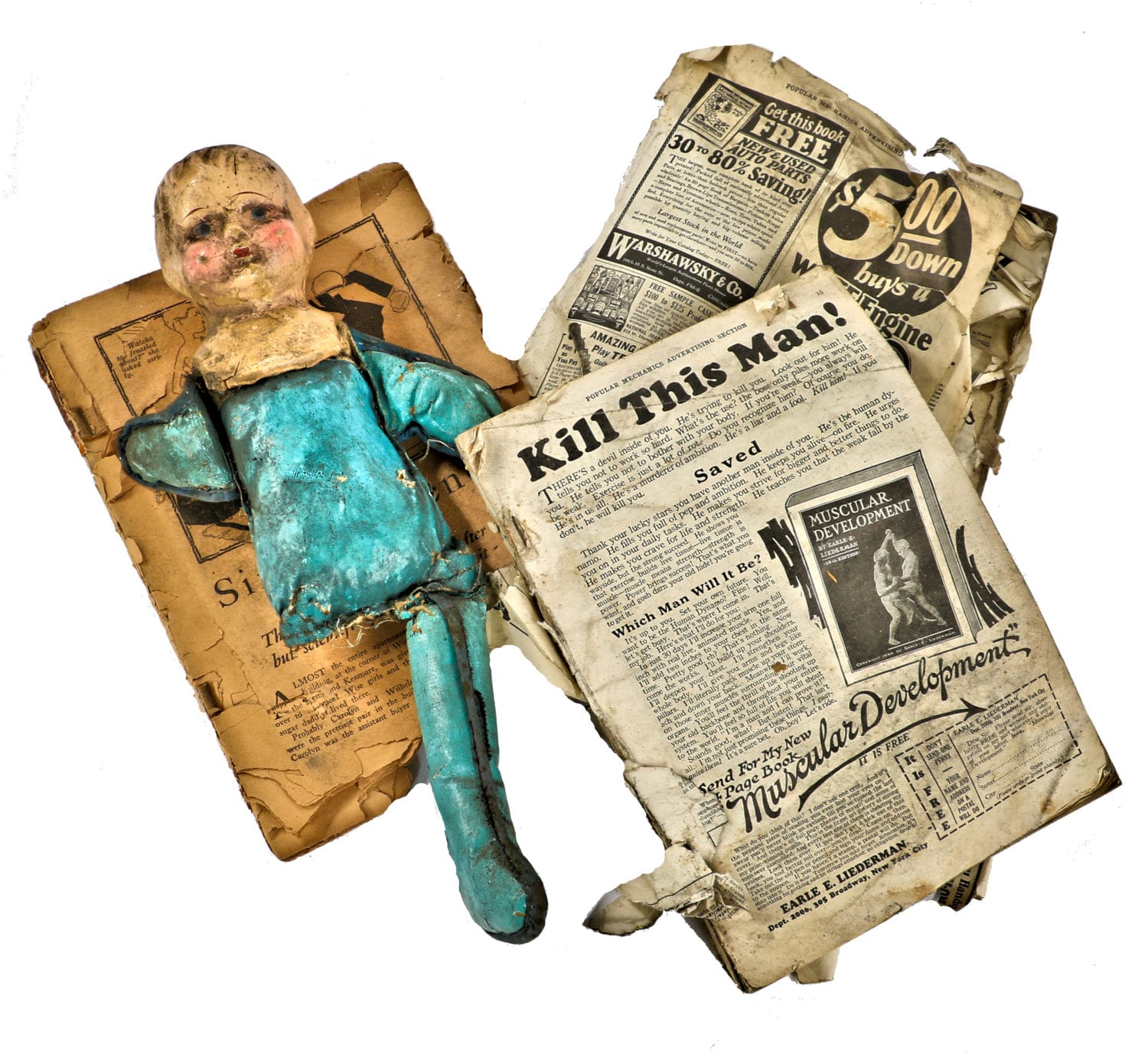 on the way back from the “mega mall” salvage on milwaukee avenue, i dropped by a chicago bungalow being wrecked by a company i’ve collaborated with in the past. the house was nearly gone, but i nevertheless found several ravaged magazines, newspapers, and a visually disturbing doll within a still-standing wall cavity. in fact, the doll was leaning upright against one of the studs when i found it. according to a neighbor watching the demolition, the house was one of three built by the same contractor in 1914. the builder and his family happened to live in the house being wrecked (i’m sure the neighboring houses will be the next to go), so it’s quite possible the doll belonged to one of his children.