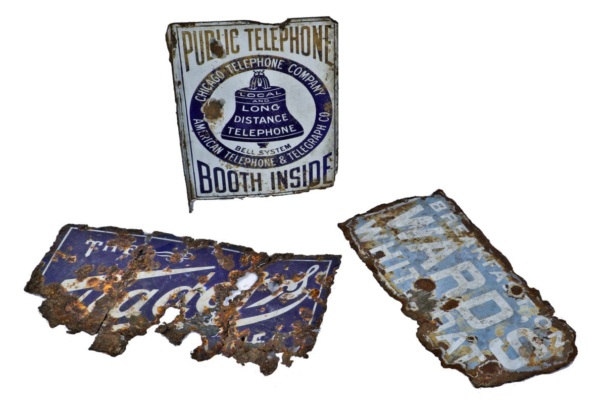 in addition to uncovering vast assemblages of bottles, shoes, boots and buckles, these communal “landfills” will often have telephone insulators, building parts and signage as well. i collect and document every buried sign i find, regardless of its state of decay – most are comprised of cold-rolled iron or steel with porcelain enameled (fused ground glass) finish. a few examples are shown below.
