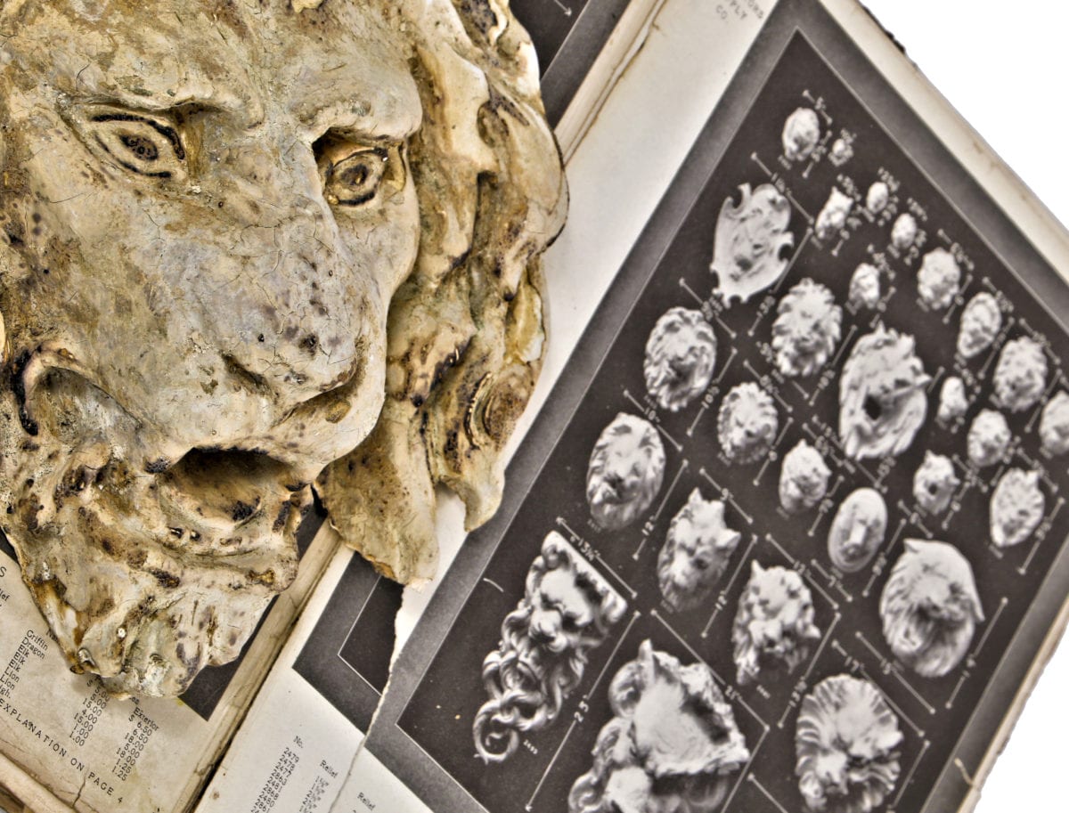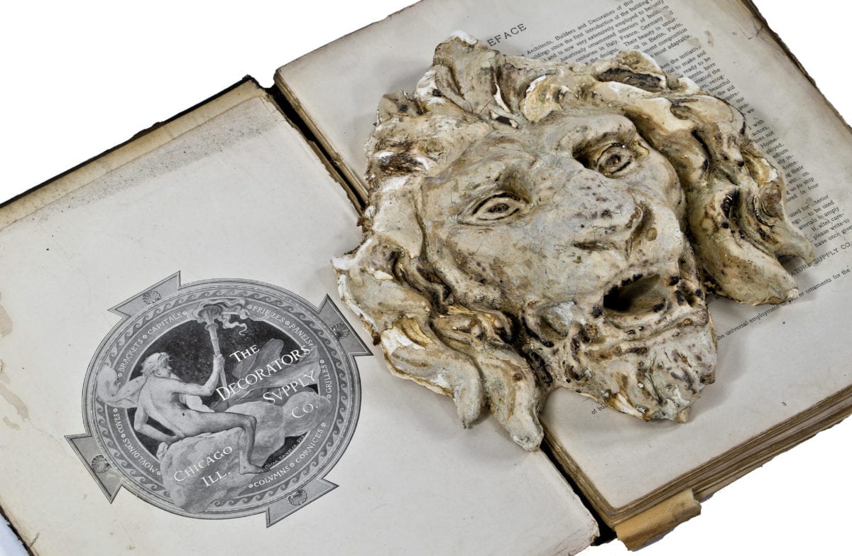 based on early “period” photographs, the dealership’s grand showroom was originally bedecked with heavily ornamented bronze and bent glass chandeliers hanging from a renaissance style cast plaster ceiling likely fabricated and installed by the decorators’ supply company of chicago. after years of neglect and abandonment the ceiling was discovered in hundreds of pieces scattered across the floor. undeterred, i gathered as many “intact” fragments as possible to create a visual record of any and all design motifs used, as well as a paint analysis to determine color finishes applied from the very beginning when it served as an automobile showroom.
