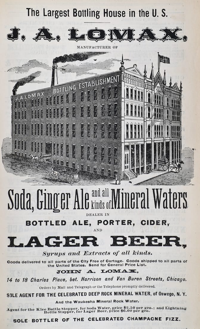 john a. lomax entered the bottling operations in 1854, distributing soda water located at 38 w. lake street in chicago. in 1859, the plant was destroyed by fire and operations were moved to a two-story frame building located at 16 charles place. as business grew, john and his son george erected a large masonry building in 1871, which was consumed by the great chicago fire the same year. shortly after, lomax rebuilt an even larger four-story facility that was advertised as being the “largest bottling house in the world.” during their peak production years, lomax serviced more than five thousand of the approximately seven thousand saloons across the city of chicago. their bottling works furnished soda-waters, ginger ale, mineral and spring water, ales and other drinks. the company ceased operations in 1885.
