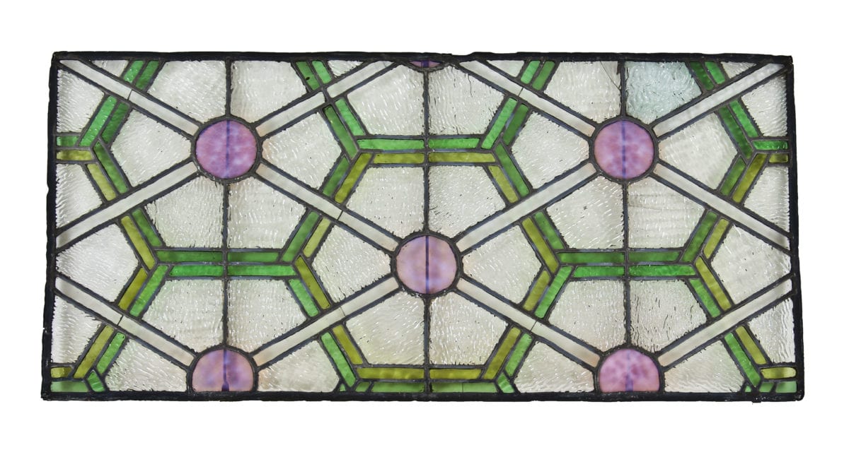 incredibly rare and highly sought after late 19th century leaded art glass skylight panels salvaged from the adler & sullivan chicago stock exchange during demolition in 1971-2. the art glass commission for the trading room skylight system was awarded to the prominent decorating firm of george louis healy & louis julian millet of chicago. the skylights had been sealed off and hidden since the 1930′s when bell savings & loan added a false ceiling among other changes. when the skylights were discovered by richard nickel et al., the three oaks wrecking company demanded a large sum of money to release the windows to the art institute, who in conjunction with other parties, were dismantling the trading room to be rebuilt at the art institute. nearly two hundred skylight panels were crated and transported to the art institute for storage. this panel was apart of that salvaged collection released by three oaks wrecking. the art glass panel is very hard to come by, considering that the majority of released panels undergoing restoration were reinstalled into the rebuilt trading room. this style of panel (note the absence of pedals surrounding the circles) were used exclusively above the balcony floor (mezzanine level), overlooking the trade room below. the panel measure approximately 35 1/2 inches by 16 3/4 inches.
