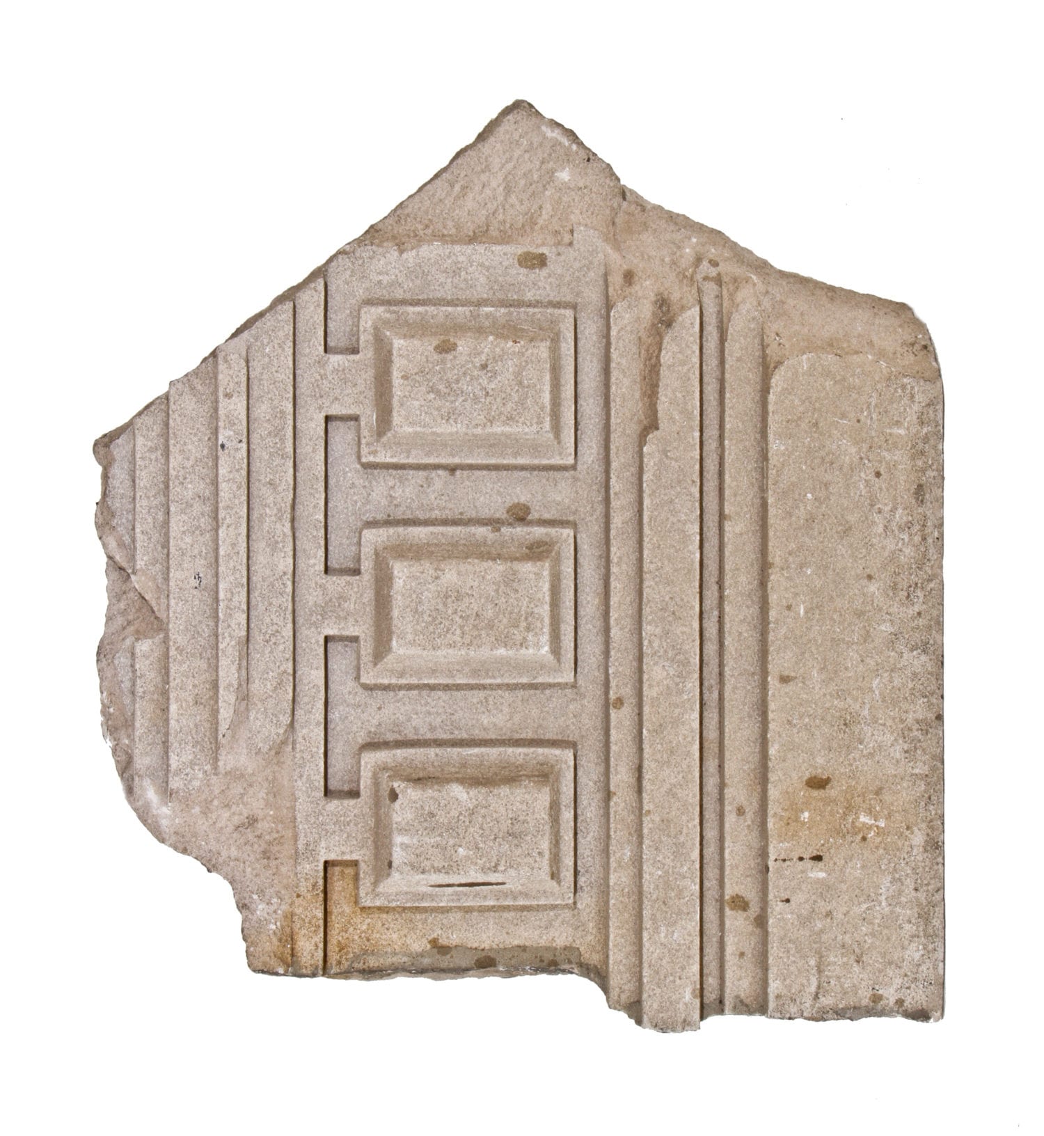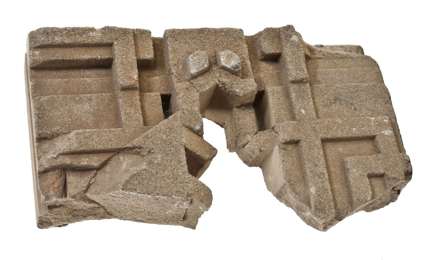 documented all original and remarkably rare c. 1914 exterior perforated cast concrete frieze block salvaged from the non-extant midway gardens complex designed by architect frank lloyd wright. the very limited number of concrete geometric designed blocks known to exist, are almost always found in various states of disrepair (i.e., broken sections, fractures, damaged surface, etc). the largely intact cast concrete block is comprised of three sections that when placed together are visually cohesive and/or a satisfactory representation of an undamaged block. the existing fragmented block has surface wear and discoloration – it was used as a “stepping stone” for many decades. other, smaller fragments are available for sale. midway gardens (opened in 1914, demolished in 1929) was a 300 ft. square indoor/outdoor entertainment facility in the hyde park neighborhood on the south side of chicago. it was designed by architect frank lloyd wright, who also collaborated with sculptors richard bock and alfonso iannelli on the famous “sprite” sculptures adorning the facility. under wrights supervision. iannelli and bock designed all but two of the sprites, and craftsman/cement expert, ezio orlandi, cast them. designed to be a european–style concert garden with space for year-round dining, drinking, and performances, midway gardens hosted notable performers and entertainers, but struggled financially year after year until october of 1929 when the structure was demolished. midway gardens was opened on the site of the former sans souci amusement park on the southwest corner of cottage grove avenue and east 60th street. edward c. waller commissioned frank lloyd wright to design and build the gardens in 1914. construction was completed very quickly, and the complex opened in june of 1914. the modernist architecture of the gardens was based on strict geometrical forms designed by wright. a large, open–air central area, filled with tables and chairs, was ringed by a series of three–story buildings with indoor spaces for dancing and other activities, as well as cantilevered balconies with overhanging roofs. there were terraced gardens, pools, and a music pavilion and stage.the building itself was made of yellow brick and patterned concrete block. it featured highly intricate ornament and many geometric sculptures, which frank lloyd wright named “sprites” and were co-designed with alfonso ianelli. in keeping with wright’s style, the building also featured rows of art glass and hidden entries. the interior was likewise intricately ornamented and filled with wright designed furniture and accoutrements, right down to the napkin rings. midway gardens was an indoor/outdoor entertainment center intended to act as a beer hall and concert/dance hall which featured bands including the midway gardens orchestra. the large area (equivalent to a city block) offered entertainment to a wide variety of people in a german-style meeting place. the gardens included restaurants, saloons, newspaper and cigar stands, and arcades. when prohibition was passed, the gardens lost part of their entertainment value. when it opened, midway gardens was an upscale entertainment venue that was also affordable to the common person. max bendix and the national symphony orchestra frequented the concert section because they were the “house band”. the ballet dancer anna pavlova performed numerous times as well. frank lloyd wright brought in popular acts to sing, dance, and play music, which created a bourgeois environment. after it became edelweiss gardens, however, the high class atmosphere switched to one of vaudeville, ragtime, and cabaret. in the beginning, business was strong, but waller never could provide adequate funding to back the construction and upkeep of midway gardens and declared bankruptcy in march 1916. at this point, midway gardens was purchased by the edelweiss (schoenhofen) brewery company and renamed “edelweiss gardens”. wright, who generally exerted strong creative control over his completed projects, was disgusted by the aesthetic changes the new owner made to the gardens, writing that edelweiss had added “obnoxious features” and that the whole effect of “the proud midway gardens” “was cheapened to suit a hearty bourgeois taste.” edelweiss gardens continued through the war years (closing briefly in 1918) and stayed open as a dry establishment during prohibition. in 1921, the building was sold once more, to the e. c. dietrich midway automobile tire and supply company, and renamed “the midway dancing gardens.” finally, in october 1929, midway gardens was closed permanently and demolished. a testament to wright’s design, the building was so solidly constructed that tearing it down sent the wrecking company into bankruptcy. the majority of the rubble was bulldozed into lake michigan to be used as a breakwall. several of the sprites and cement blocks survived the demolition because the original sculptor, iannelli, managed to retrieve a few segments. also, demolition contractor, william j. newman, took several sculptures and cement blocks to his farm in wisconsin. many years later when wright heard of their survival, he purchased them and they remained with his estate. other sculptures that escaped demolition can be found in private collections and museums. the concrete block measures 33 x 37 x 5 inches. reference only.