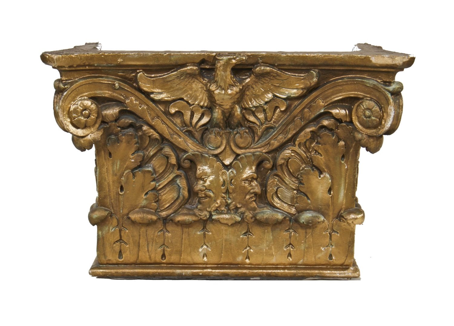 gold painted ornamental cast plaster interior lobby pilaster capital salvaged from the nortown theater (1931). the atmospheric style movie palace was designed by architect j.e.o. pridemore. the three-sided plaster capital was fabricated by the decorators’ supply company, chicago, ills. the painted plaster artifact was salvaged from the north side chicago nortown theater (demolished in 2007). the atmospheric nortown theater was designed and built in 1931 by architect j.e.o. pridmore and the paschen brothers as general contractors. containing over 2000 seats, the auditorium was modeled after the mediterranean region of europe, with an italian courtyard overlooking the sea. the walls gave off an illusion of a seascape and garden scene containing the exteriors of villas with tile rooftops. the audience was seated in full view of the ocean, with lighthouse effect and ships passing in the offing. the nortown was considered the first theater given a pronounced marine treatment. the auditorium ceiling was designed to emulate an “april constellation,” with astronomy professor j.c. penn of the armour institute, commissioned to arrange the stars in their proper places to ensure an authentic layout.