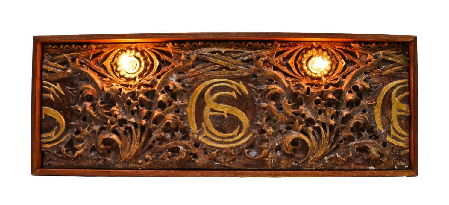 rare and completely intact museum-quality monogrammed cast plaster frieze panel or section salvaged from the chicago stock exchange building trade room prior to demolition in 1971-72. the reinforced ornamental horsehair (binding agent) plaster panel features a very rich and intricately designed organic design motif in deep relief. the repeating central medallions contain the “cse” (chicago stock exchange) monogram in fanciful, overlapping lettering. originally, edison “long neck” light bulbs with hairpin carbon filaments protruded from the beaded border openings along the top of the panel. the lightly restored gilded finish has darkened significantly with age. the raised lettering was retouched with gold leaf. the delicate single-sided plaster panel has been professionally mounted within a varnished oak frame and/or shadow box with period appropriate sockets added to the backside. the “tipped” hairpin filament carbon incandescent light bulbs are period appropriate. the framed plaster panel is secure and stable. the two porcelain bare bulb sockets have been wired with braided cloth lamp cord that feeds out the back. the low-watt lighting accentuates the deeply embossed foliage flanking the monograms. the louis sullivan-designed panel was likely fabricated by the decorators’ supply company of chicago, il. built on the site of the first brick building in chicago (1837), the 13 story steel frame chicago stock exchange building was designed by the architectural firm of adler and sullivan with falkenau & company as general contractors. the building was completed in 1894 at a total cost of $1,131,555.16. the stock exchange contained 13 stories with the single basement containing both pile and caisson foundations (the latter were used don the west party wall). the building contained 480 offices. the stock exchange was the second largest commission awarded to sullivan and adler (the largest being the auditorium hotel and theater). the building’s exterior was outfitted with ornamental buff-colored terra cotta designed by sullivan and fabricated by the northwestern terra cotta company. the structural system consisted of fireproofed steel framing. the first floor was treated on the exterior as basement, with the second and third floors as an arcade, bay windows extended from the fourth through the twelfth floor and the thirteenth contained a colonnaded ribbon of windows topped by a projecting cornice with a richly worked surface. the interior contained shops on the ground floor with offices on the upper floors of the main block and wings. the elevators were located at the center of the building. the trading room occupied one-half of the second and third floors. the two sets of stairways were found on floors 4-13. the highly stylized staircase was comprised of copper-plated ornamental iron, oak railings and white marble treads. when the stock exchange moved in 1908, the trading room was converted into office space and later bank. during the course of demolition in 1972, photographer and activist richard nickel was working to salvage ornament the building when the unstable structure collapsed and he was tragically killed. as a tribute to nickel from and sullivan, sections of the trading room stencils, molded pilaster capitals, and art glass were preserved and in 1977 the art institute created a complete reconstruction of this significant room in a new wing of the museum. at the same time, the monumental entry arch of the stock exchange was erected on the museum grounds near the corner of monroe street and columbus drive.
