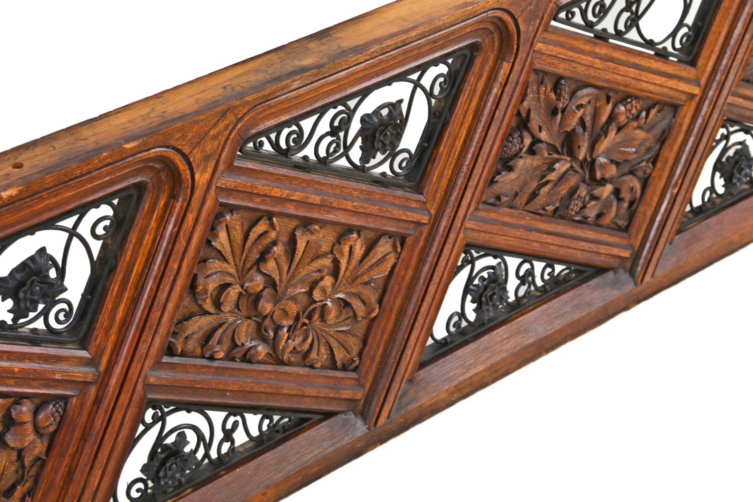 exceptional historically important late 19th century all original and unrestored american quartered white oak wood and wrought iron potter palmer mansion interior staircase angled railing. the documented residential staircase railing was salvaged from the palmer mansion prior to demolition in 1950. the completely intact railing section features multiple hand-carved panels featuring very intricate floral motifs in deep relief. the spaces above and below the rectangular-shaped carved panels contains very ornate and delicate wrought iron with the original black enameled finish intact. the staircase was constructed by or under the supervision of john newquist. the exact fabricator and/or foundry (that executed the iron panels) is not known. the interior side of the railing, which faced the treads and risers, contains unornamented beveled edge wood panels. the original varnished finish remains in great overall condition, considering age. the non-extant potter palmer mansion, constructed 1882–1885 at 1350 n. lake shore drive, was once the largest private residence in the city of chicago. the plamer mansion was located in the near north side neighborhood of the city, facing lake michigan. it was designed by architects henry ives cobb and charles sumner frost of the firm cobb and frost (navy pier, chicago athletic associaton, etc.), and built for potter and his wife bertha . palmer was a prominent chicago businessman who was responsible for much of the development of state street. the construction of the palmer mansion on lake shore drive established the “gold coast” neighborhood – still considered to be one of the most affluent neighborhoods in the city. at the time of the construction of the mansion, mr. palmer was already responsible for much of the development of state street. after the great chicago fire of 1871, the buildings (including the newly0built palmer house) on state street were destroyed, and palmer was yet again responsible for its redevelopment. construction on the mansion began in 1882, and its exterior work was completed in 1883. however, interior decoration by a number of notable interior designers would continue for another two years before the building was entirely complete. the interiors were completed under the direction of architect joseph lyman silsbee. john newquist, who had already worked with palmer on numerous other constructions, was chosen as the contractor and stair constructer. although it was originally budgeted at $90,000, after five years of construction, the mansion would cost the palmers more than a million dollars. the mansion featured a three-story italianate central hall under a glass dome. other rooms were finished in a variety of historic styles: a louis xvi salon, anindian room, an ottoman parlor, a renaissance library, a spanish music room, an english dining room that could seat fifty, and a moorish room, the rugs of which were saturated with perfumes. a collection of paintings, collected by bertha palmer, adorned the mansion’s grand ballroom, 75-foot long. the room’s murals in the frieze above them were by gabriel ferrier. the architects referred to its architectural style as early romanesque or norman gothic. alternatively, the mansion was supposedly based on a german castle. the mansion’s exterior included many turrets and minarets, and on the interior, a spiral staircase without a center support, rising 80 feet into the central tower. two elevators also served the building. the palmers constructed their mansion’s outside doors specifically without locks and knobs so that the only way to get in was to be admitted from the inside. the palmer mansion was used for many social gatherings, including entertaining former u. s. president ulysses s. grant, during his visit to the city, and receptions during the 1893 world’s columbian exposition for which bertha palmer was a major planner and booster. the palmers also received many other guests, including: two other u. s. presidents, william mckinley and james a. garfield; the duke and duchess of veragua; the prince of wales, later to become king edward vii; as well as the spanish princess infanta eulalia. when potter palmer died in the mansion in 1902, he left his wife with a fortune of $8,000,000. after his death, bertha palmer continued to reside in the house, as well as in homes she maintained in london and paris, until she died at her winter residence in sarasota, florida. she invested heavily in real estate in florida where she developed farms, dairies, and cattle ranches that she administered herself. even with these great investments in land, she parleyed the fortune into almost double what she had been left and, in 1918, bequeathed an estate of $15,000,000 to her sons honoré and potter palmer, jr., who sold the chicago mansion in 1930, for $3,000,000, to the industrialist vincent hugo bendix, who had invented an automobile starter. bendix renamed the property “the bendix galleries,” after adding paintings by rembrandt and howard chandler christy to bertha palmer’s former art collection. while residing within the mansion, he modernized the elevator, and installed a barber’s chair for his own use. after living on the property for about five years, vincent bendix announced that the mansion would be razed to allow construction of the world’s largest hotel on the site, estimated at approximately $25,000,000. the project was never put into action, and the property was sold to potter palmer’s son in 1933 for $2,000,000, the amount of the building’s mortgage. the mansion stood vacant for years until it was demolished in 1950, to be replaced by two 22-story high-rise apartment buildings housing 740 families. the mansion’s painting gallery, including works by french painters claude monet, pierre-auguste renoir, and edgar degas that were collected by bertha palmer, were transferred to the art institute of chicago, and the furniture was sold. multiple sections (smaller in siz
