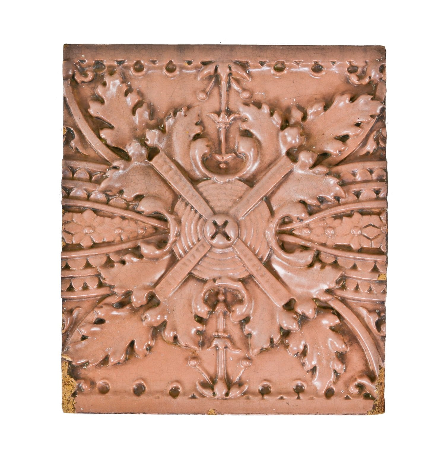 distinctive late 19th century american ornamental glazed terra cotta frieze panel salvaged from the non-extant ywca building entrance surround during the winter of 2009. the deeply embossed floriated panel features a rather unusual salmon-colored glazed finish. the terra cotta block has been reconfigured by removing the hollow cavities on the backside to significantly reduce the overall weight and make it more “wall-friendly” and/or manageable for display purposes. the block is attributed to notable terra cotta fabricator northwestern terra cotta company of chicago. surface wear and residual paint evident. the seven-story red brick and terra cotta ywca hotel (located at 830 south michigan avenue) was designed by chicago architect john m. van osdel ii, nephew of prominent chicago architect john mills van osdel ii. construction of the property was completed in 1895. the late19th century hotel is one of the oldest ywca buildings in the country, and was the first to be built in the city of chicago. the ywca originally used to house working women newly arriving in the city following the 1893 world’s fair. located near the illinois central railroad station and within a reasonable distance to the heart of the loop, it was was designed to take advantage of views along michigan avenue and the lake, with projecting triangular bay windows on the top floors and a renaissance inspired loggia dressed in ornamental terra cotta on the second floor. in 1929, the building became the south michigan hotel. in the 1970’s the hotel was purchased by johnson publications and converted into offices. the badly dilapidated and structurally compromised building was essentially abandoned for nearly thirty years. the building finally succumbed to the wrecking ball in 2009. urban remains salvaged much of the exterior and interior ornament prior to, and during demolition.