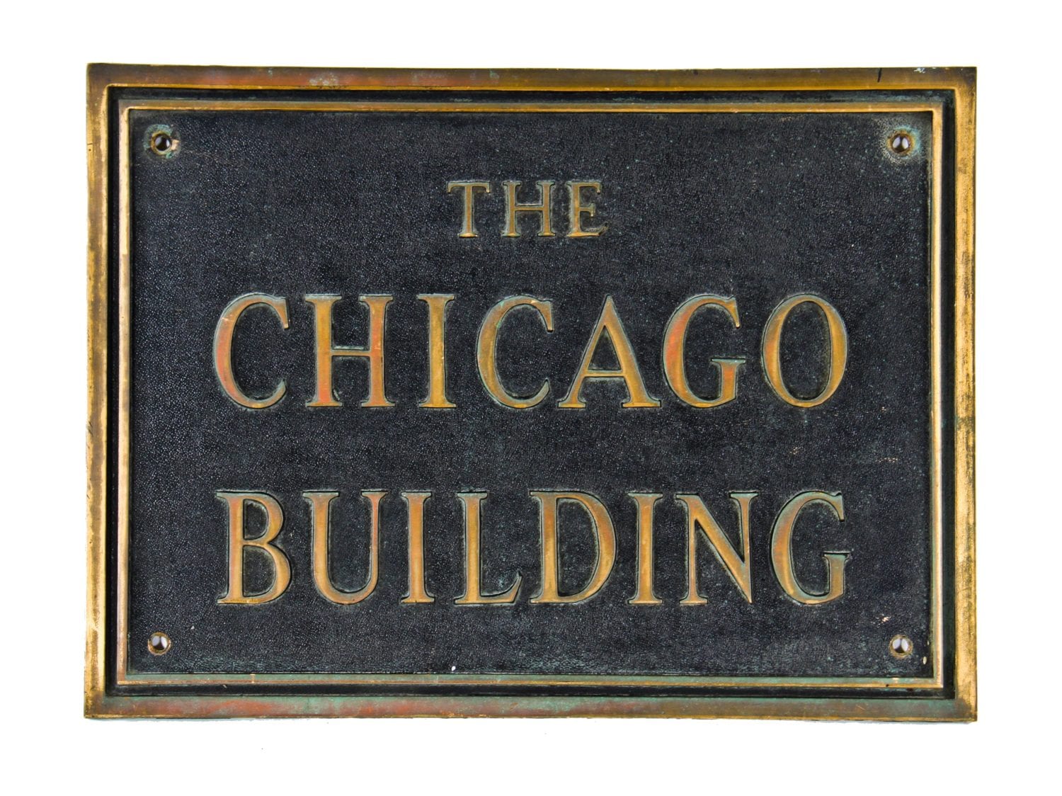original and unaltered museum-quality early 20th century single-sided solid cast bronze exterior chicago building sign plaque possibly fabricated by the winslow brothers of chicago, il. the surface mount building sign or plaque contains fanciful raised lettering against the original baked black enameled background (used to accentuate the lettering). the plaque contains four screw holes in each of its corners for mounting purposes. the raised edges and lettering contain surface oxidation consistent with age. the building sign plaque was likely installed shortly after contruction drew to a close, or perhaps shortly thereafter. the sign was removed when the building was converted into a dormitory with booth hansen as architects. oddly, the landmark plaque was removed at the time. the landmarked 14-story chicago building (also known as the chicago savings bank building) was constructed between 1904-1905 by the notable chicago-based architectural firm of holabird and roche. the extant structure remains an exceptional early and highly visible example of the chicago school of architecture. the chicago building’s exterior features characterize this style through the use of large “chicago windows,” a metal frame skeleton, protruding bay windows, and a terra cotta curtain wall. the combination of the north side projecting bay windows and the east side rectangular “chicago windows” with movable sashes is representative of the two typical chicago school window types. the building is one of only a very few where the original cornice remains intact. the building is prominently located on the southwest corner of state street and madison street, with visibility increased by an offset in the alignment of state street. the building is a critical component of a grouping of significant structures, including carson pirie scott and the former mandel brothers store, at what was once labeled the “world’s busiest corner.” the building was designated a chicago landmark on march 26, 1996. in 1997, the commercial building was converted into a dormitory for the school of the art institute of chicago. interestingly, the corner of the 3rd floor of the building contains the “cornerstone of chicago.” it is the 0-0 degree point of the city, and is the location from which all addresses in the city begin. measures 24 x 18 inches.