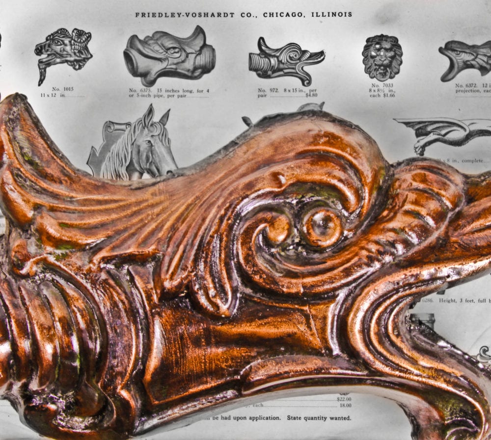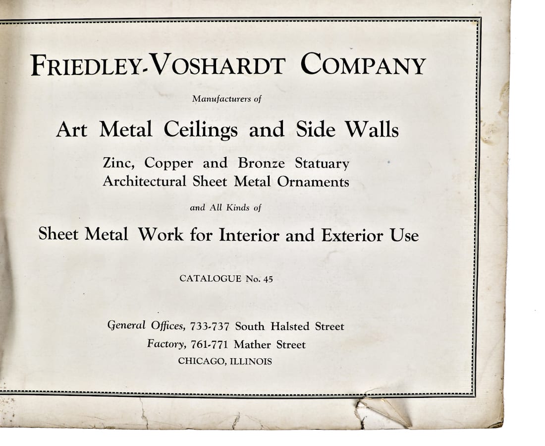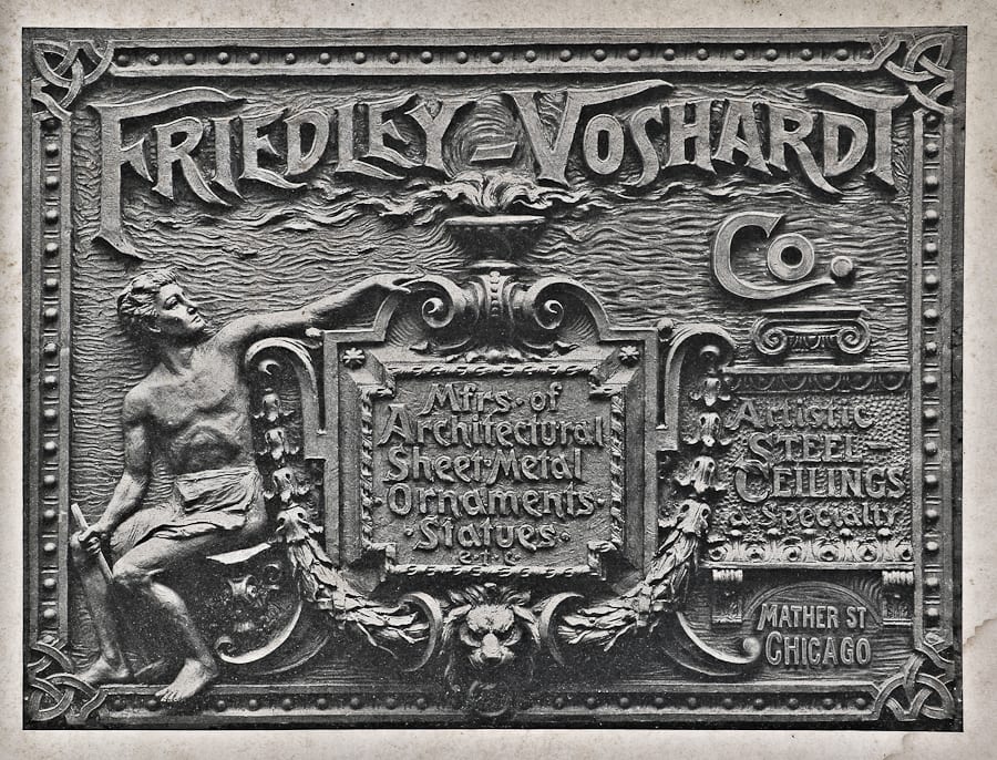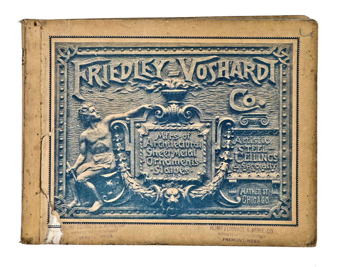 together, friedley and voshardt manufactured architectural sheet metal during the late 19th century into the late 1920’s, after which time both men passed away. catalogs display an extensive assortment of figurative and decorative statues, building ornament, brass “fixture” parts or fittings, and interior tin metal ceilings. a number of patents were taken out in the names of both men, for design-work and devices associated with metalworking.