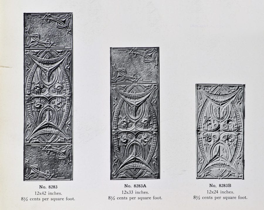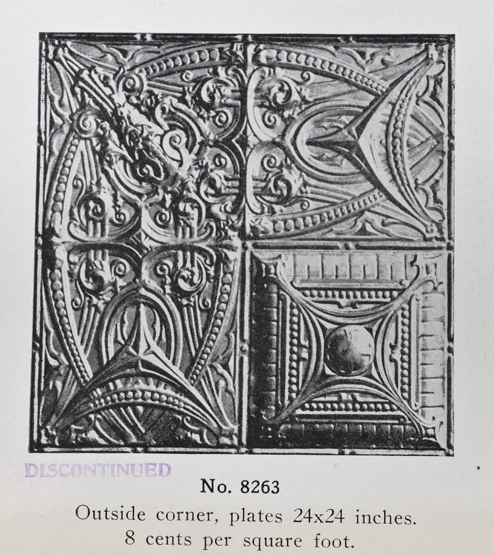 after nearly ten years, i was delighted to finally come across a catalog that definitively identifies the fabricator behind a small collection of stamped steel or tin “sullivanesque” style ceiling panels i’ve had in my possession all these years. this was one of the more substantial discoveries of the week, so i am pleased to share images of tin ceiling panels that now reside in the bldg. 51 collection, and the accompanying illustrations from this newly acquired catalog. the publication features several other visually striking tin ceiling patterns, along with other striking ornament (e.g., weather-vanes, gutter-spouts, cornices, signage, etc.).