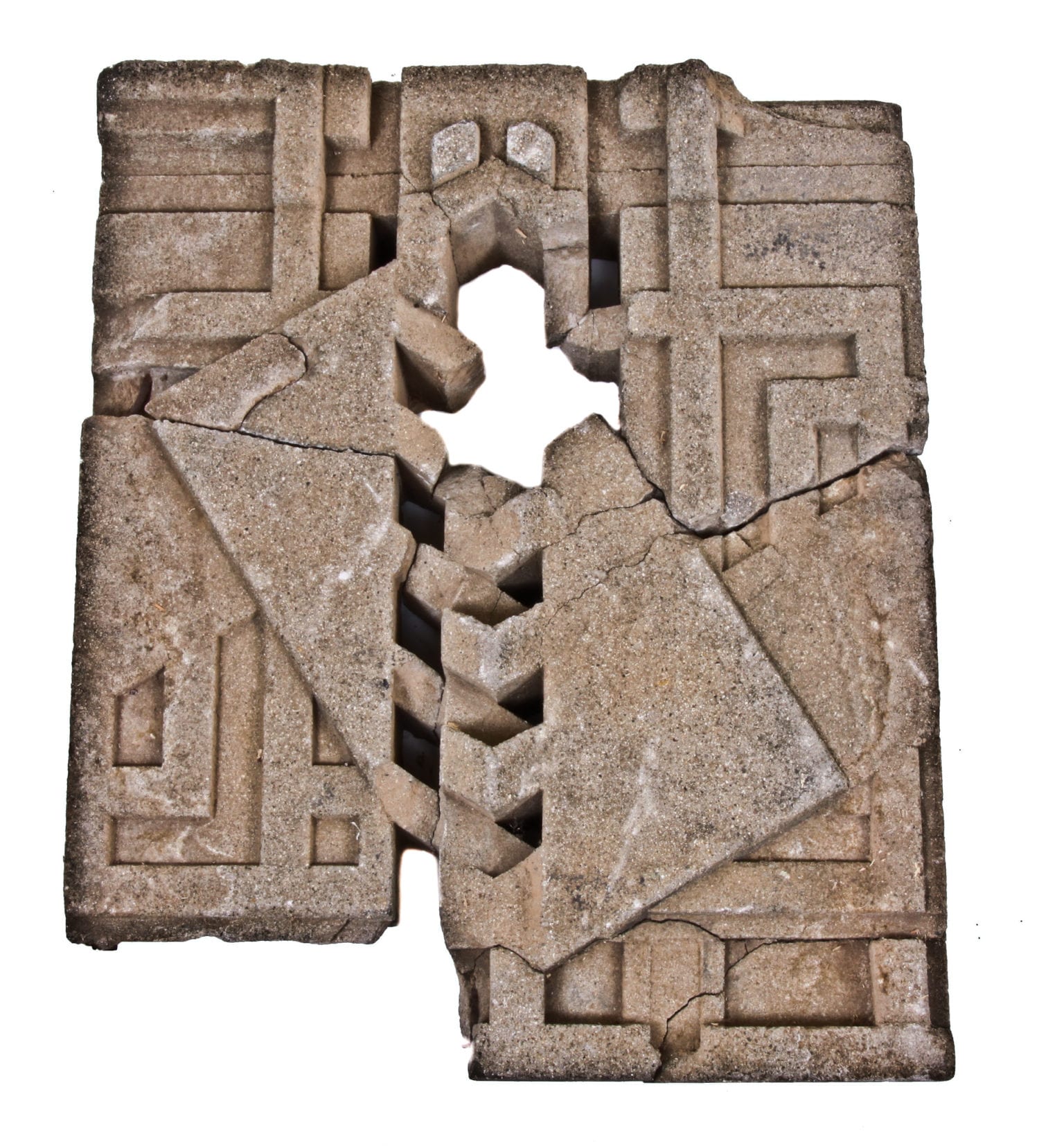 the abstract figural sculpture is comprised of cast concrete with material and finish identical to the original. the architectural fragment has been mounted on a custom-built welded joint stand, comprised of a solid steel rod affixed to a flat heavy gauge steel plate with a brushed metal finish for display in the museum.
