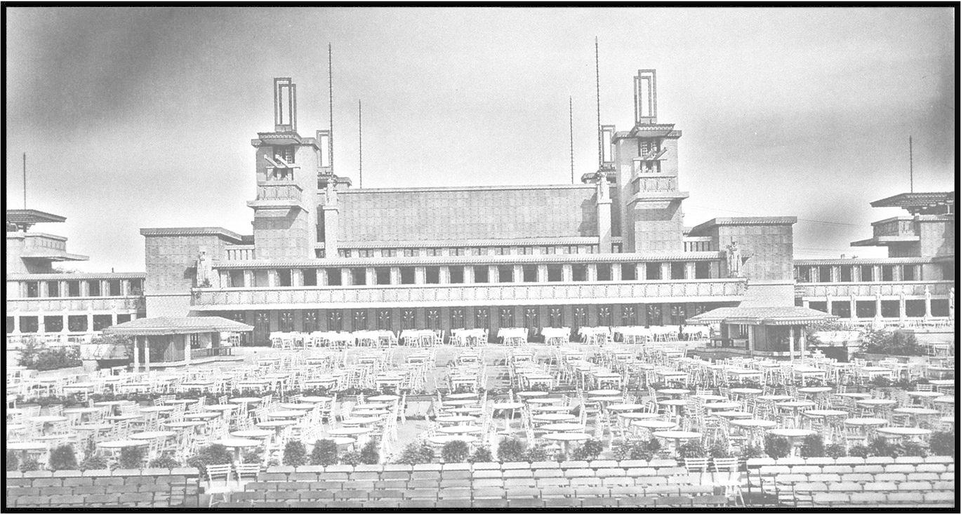 the modernist architecture of the gardens was based on strict geometrical forms designed by wright. a large, open–air central area, filled with tables and chairs, was ringed by a series of three–story buildings with indoor spaces for dancing and other activities, as well as cantilevered balconies with overhanging roofs. there were terraced gardens, pools, and a music pavilion and stage.the building itself was made of yellow brick and patterned concrete block. it featured highly intricate ornament and many geometric sculptures, which frank lloyd wright named “sprites” and were co-designed with alfonso ianelli.