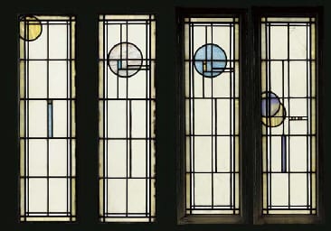 wright was also publicly dismissive of elmslie’s talents, and letters from elmslie to wright reveal much about their thorny contentions and differing sense of loyalty to sullivan. even as elmslie defended sullivan’s work, he acknowledged that sullivan resented him for garnering more work following completion of the babson house. in fact, elmslie broke with sullivan directly after completion of the mansion, mostly out of financial necessity. he went on to work for william purcell, and the firm of purcell & elmslie woud be brought onboard to renovate the babson house, creating additional leaded glass windows for the dwelling. again during the 1920’s, elmslie returned for another renovation, in which he created windows that contained large circles, reminiscent of the coonley playhouse windows designed by wright in 1907.