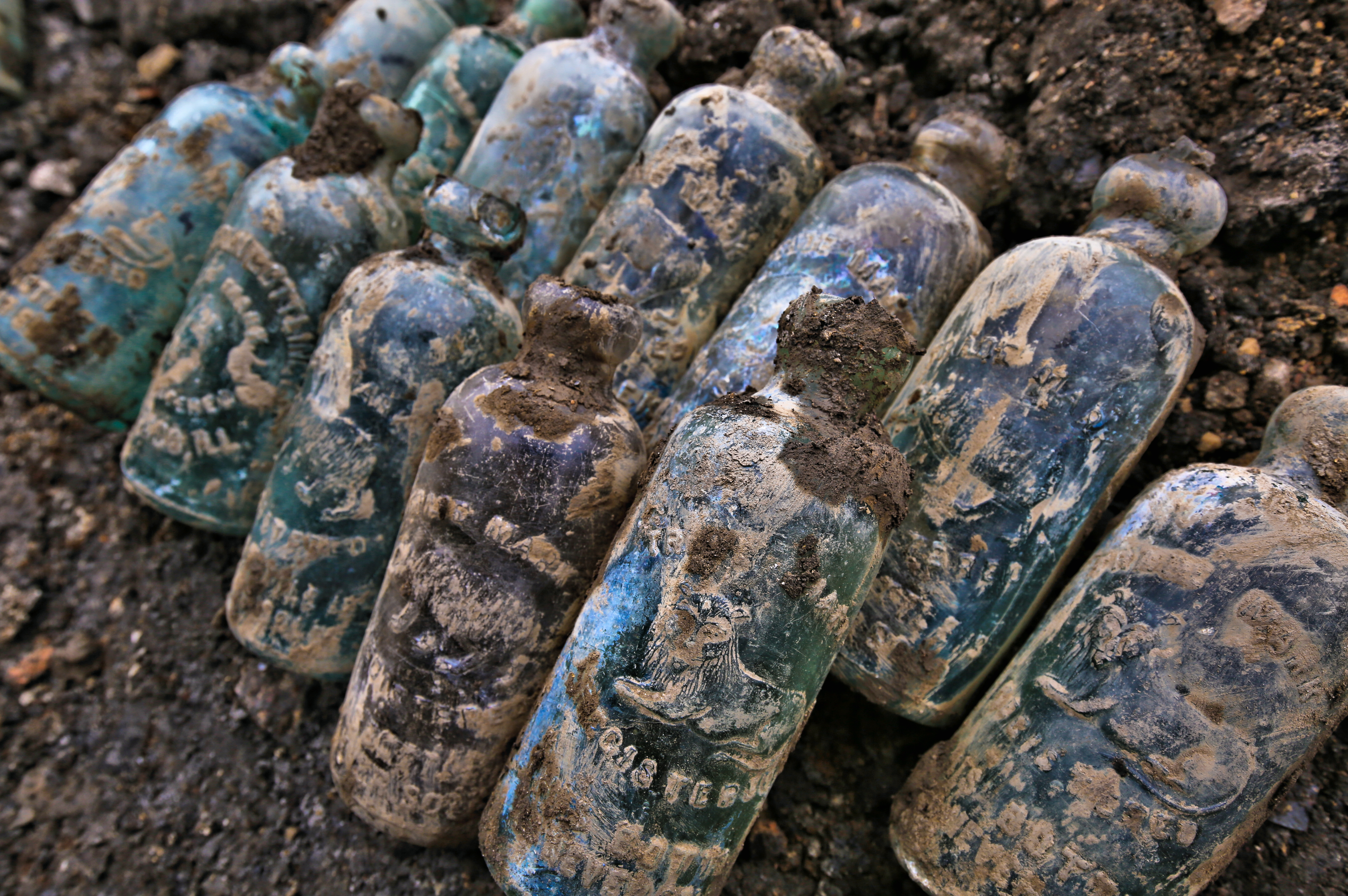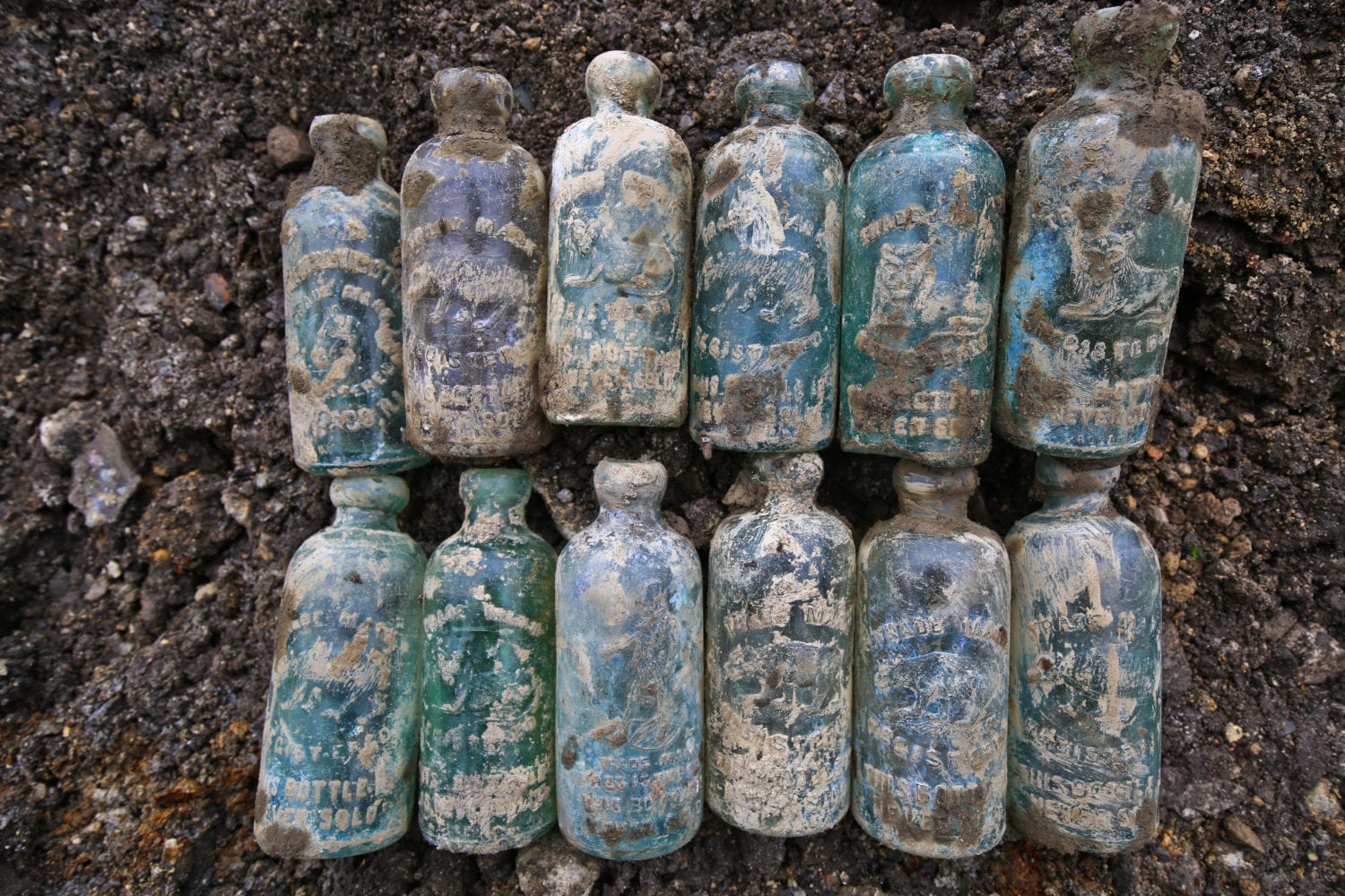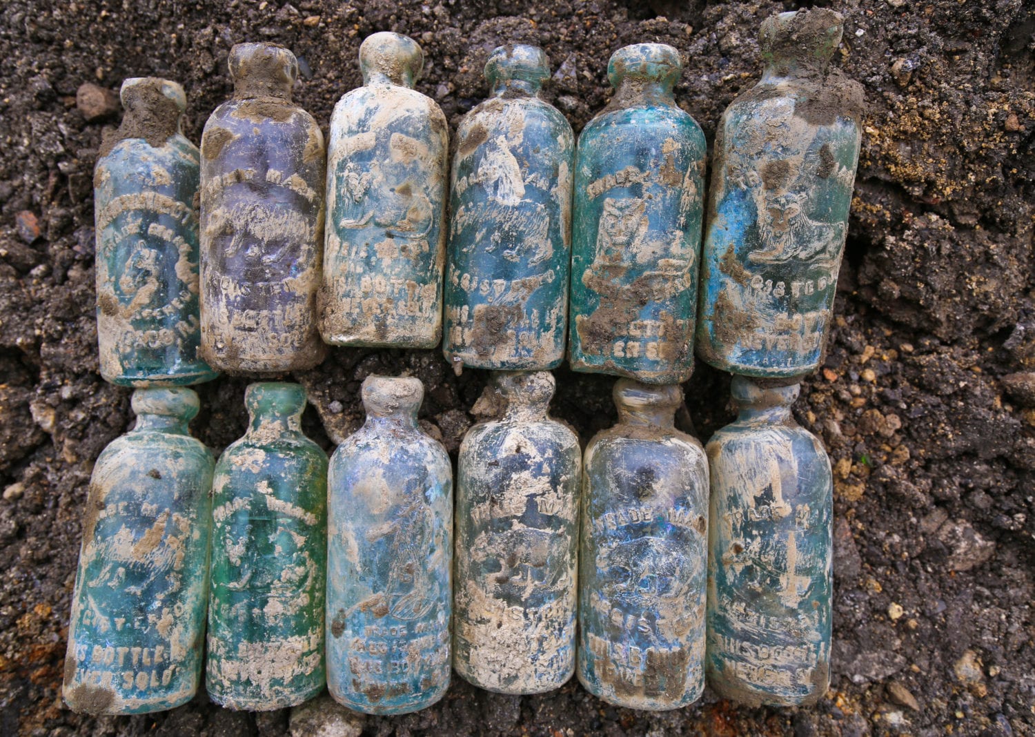 pile of 19th century “pictorial” hutchinson bottles discovered behind ace on ashland