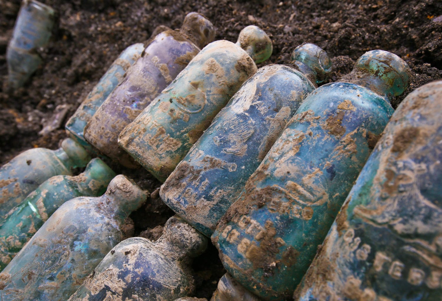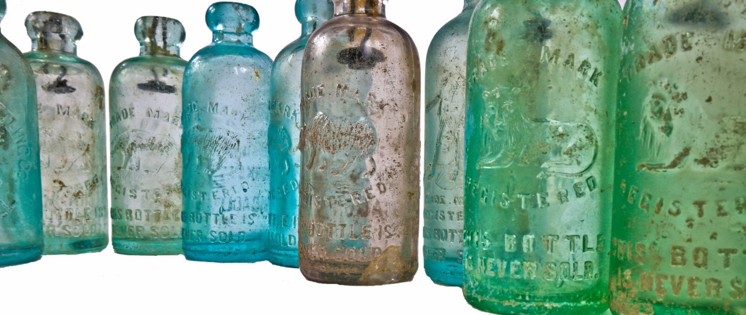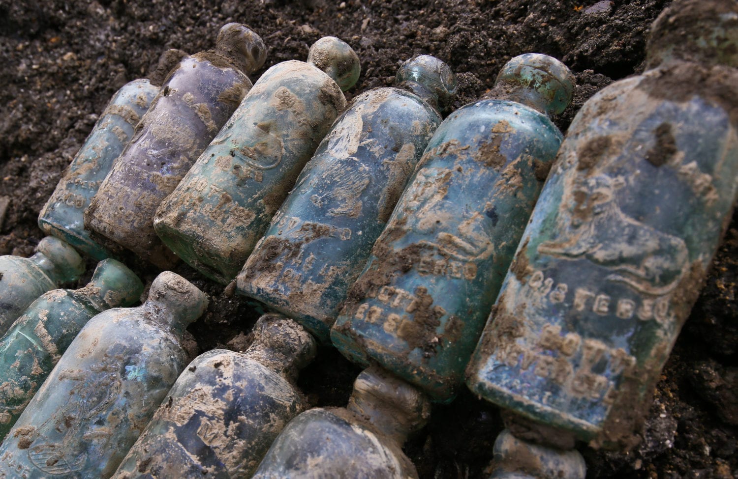 pile of 19th century “pictorial” hutchinson bottles discovered behind ace on ashland