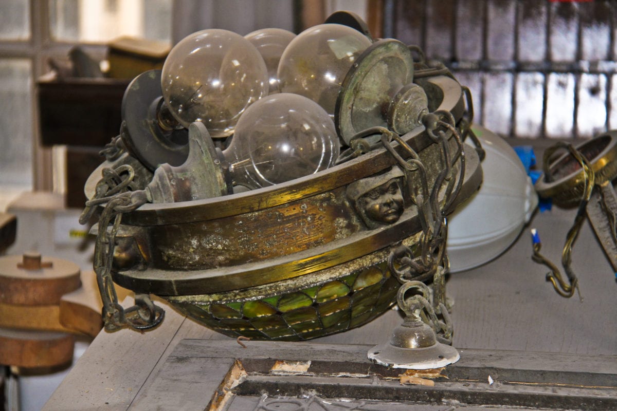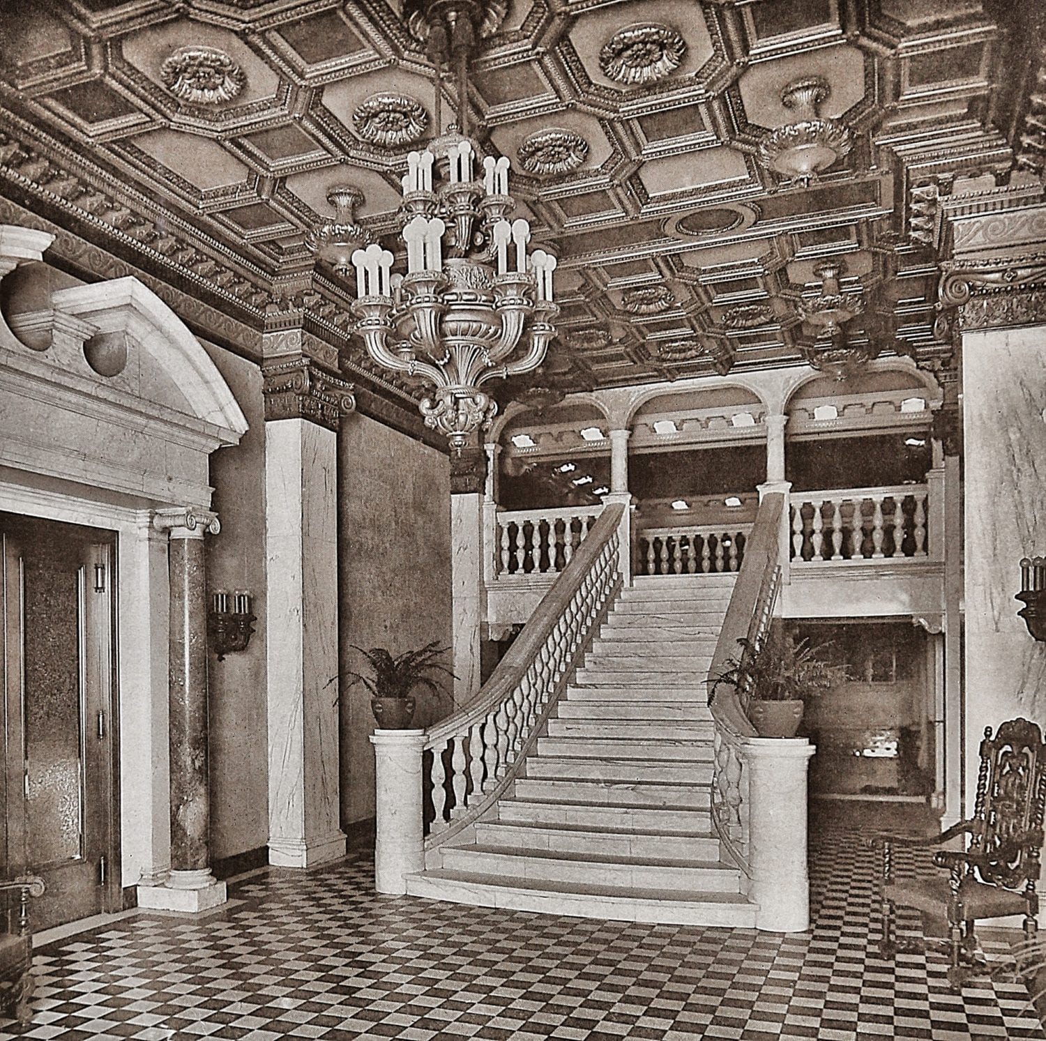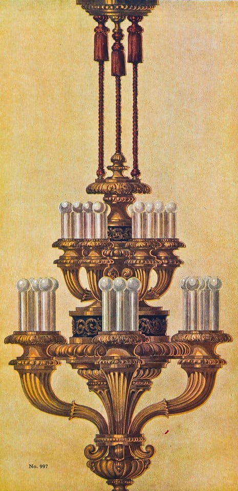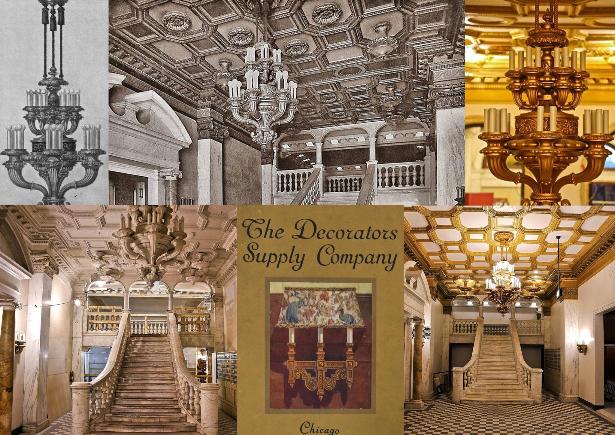 one of the highlights from documenting the lengthy transformation came when i discovered an early 20th century decorators’ supply company catalog that not only confirmed the fabricator of the chicago athletic club lobby’s main candelabra chandelier (along with wall sconces, coffered ceiling, and “bare bub” plaster pendants), but in addition, provided a full-page black and white photograph of the chandelier hanging in the newly remodeled lobby.