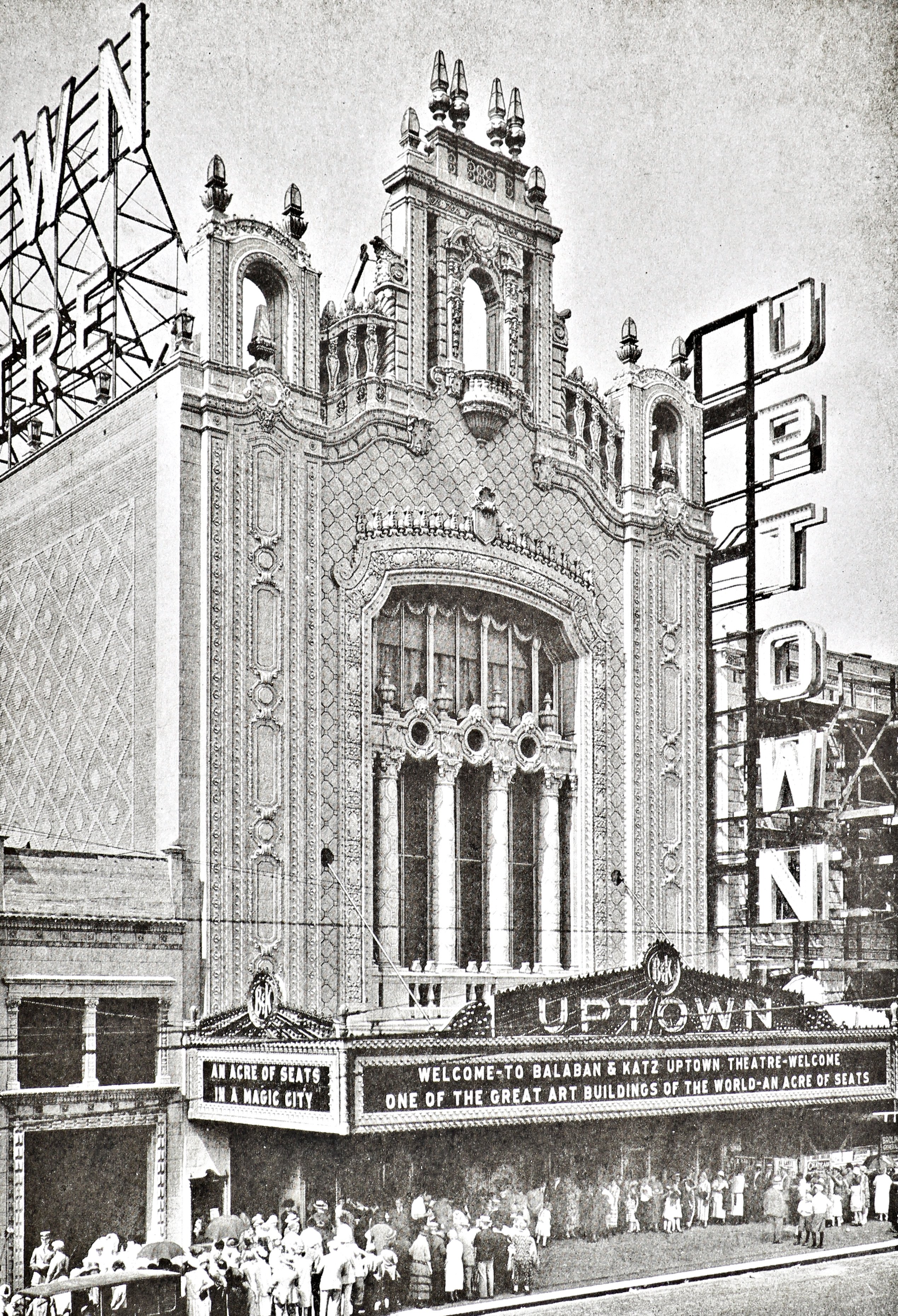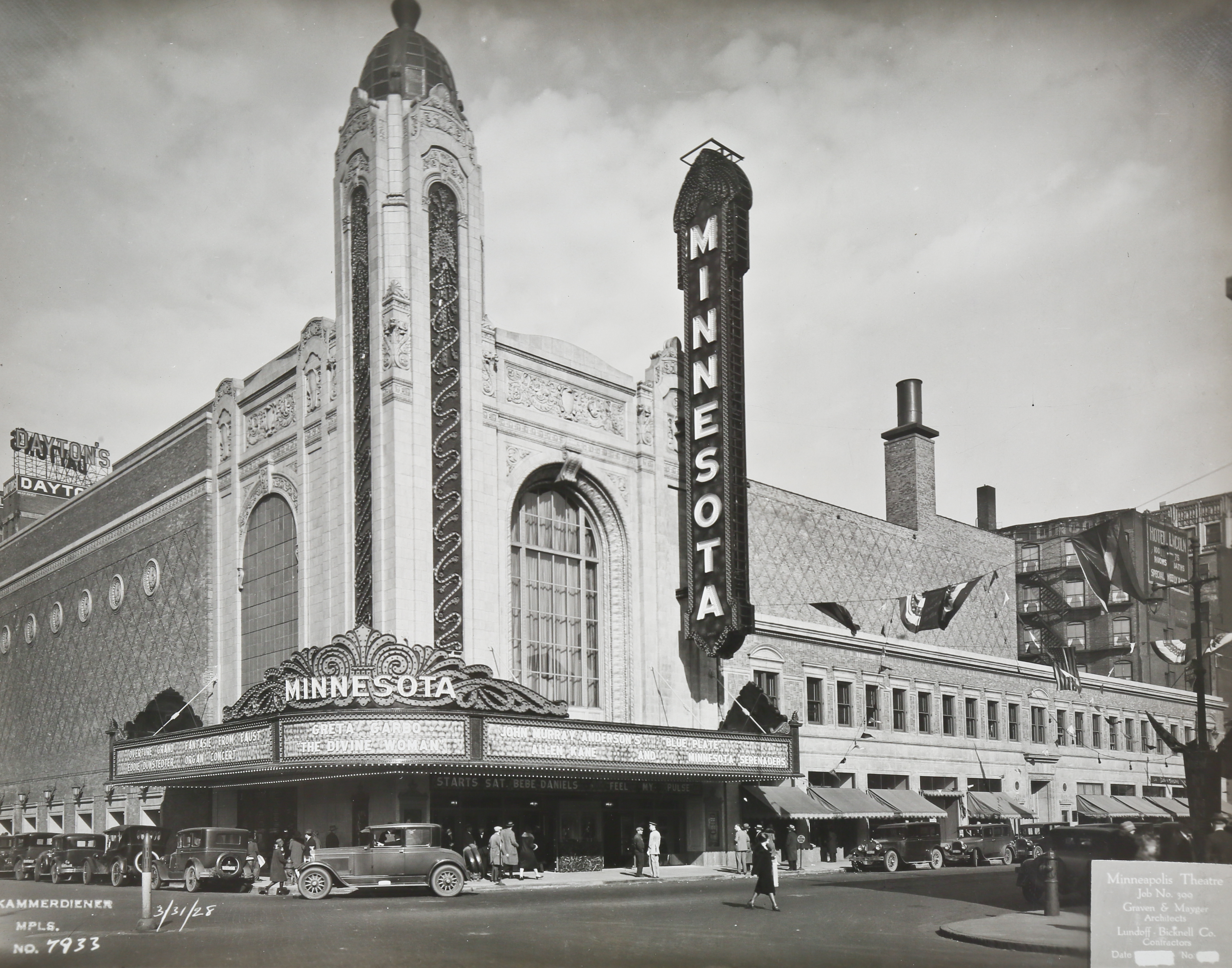 they then designed the now lost minnesota theater, a 4,000-seat monster in the twin cities; an italo-french renaissance masterpiece featuring a three-story grand lobby embellished with marble and an enormous crystal chandeliers, all based upon the sainte-chapelle at versailles. nearly the size of grand central station, at 150 ft long, 45 ft wide, and four stories high, it was larger than many downtown minneapolis theatres. the vaulted ceiling decorated with blue, rose, and gold coffered panels, as well as the grand marble staircase known as the ‘stairway to happiness’ provided the lobby with a properly sumptuous air. the auditorium itself was the fifth largest in the united states at the time, crowned with a spectacular dome full of hidden lights allowing it to take on various colors. the stage was more than sixty feet wide, and included a hydraulic orchestra lift as well as a four-manual wurlitzer organ. it’s exterior was clad in various shades of white terra cotta and topped by a domed tower with decorative polychromed terra cotta, which was illuminated at night. aside from this crowning feature, another standout was the 75 ft. marquee sign, said to have contained ten thousand lights. in part, the lighting helped doom the theater from the very beginning. its sheer size and massive overhead (at least 300 people were required to run the place, some of whom did nothing but change the light bulbs) made it virtually impossible to keep open. after over a decade of rotating ownerships and closures, the theater closed in 1958 and in 1959 was leveled and replaced by a parking ramp.