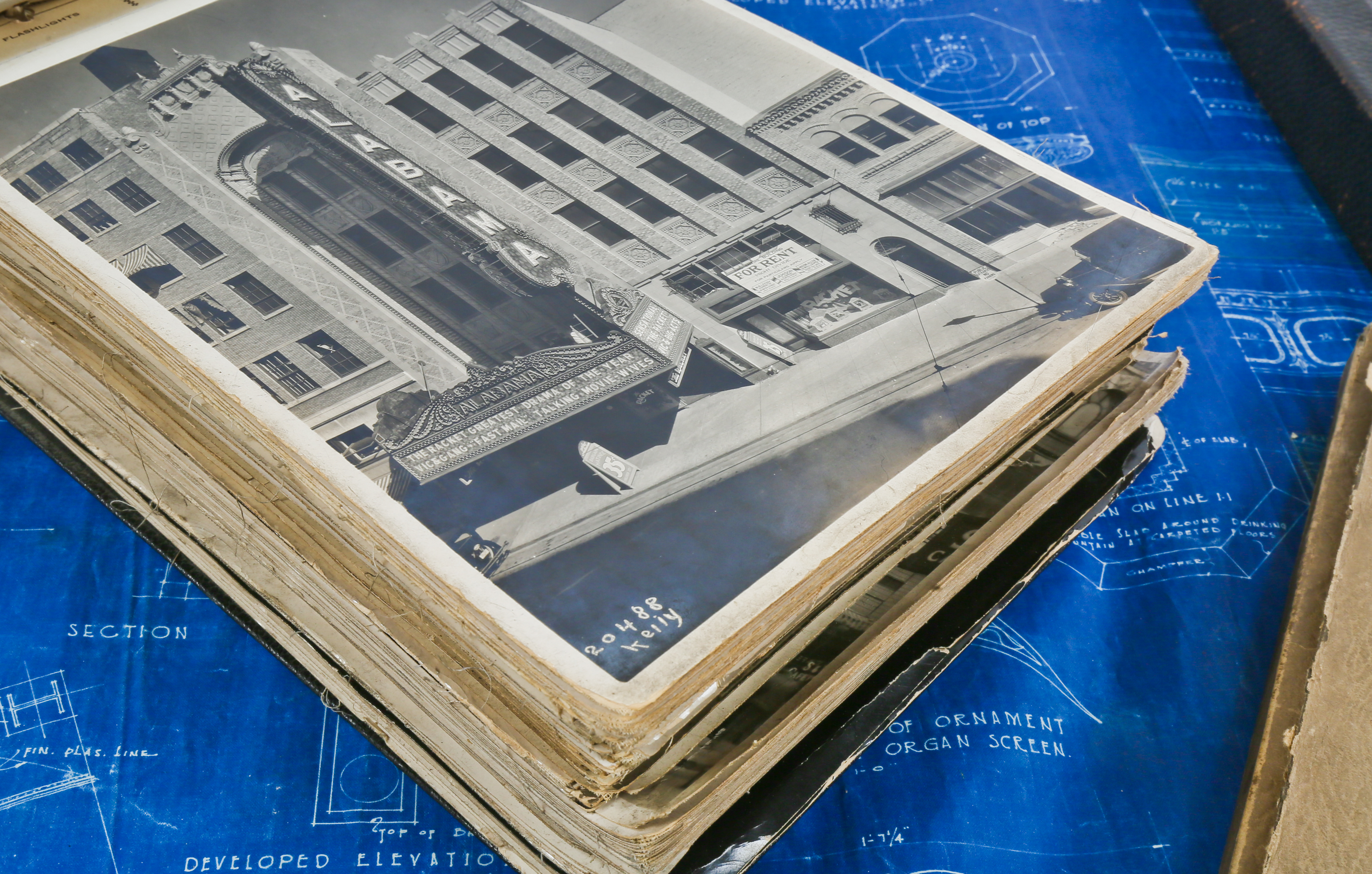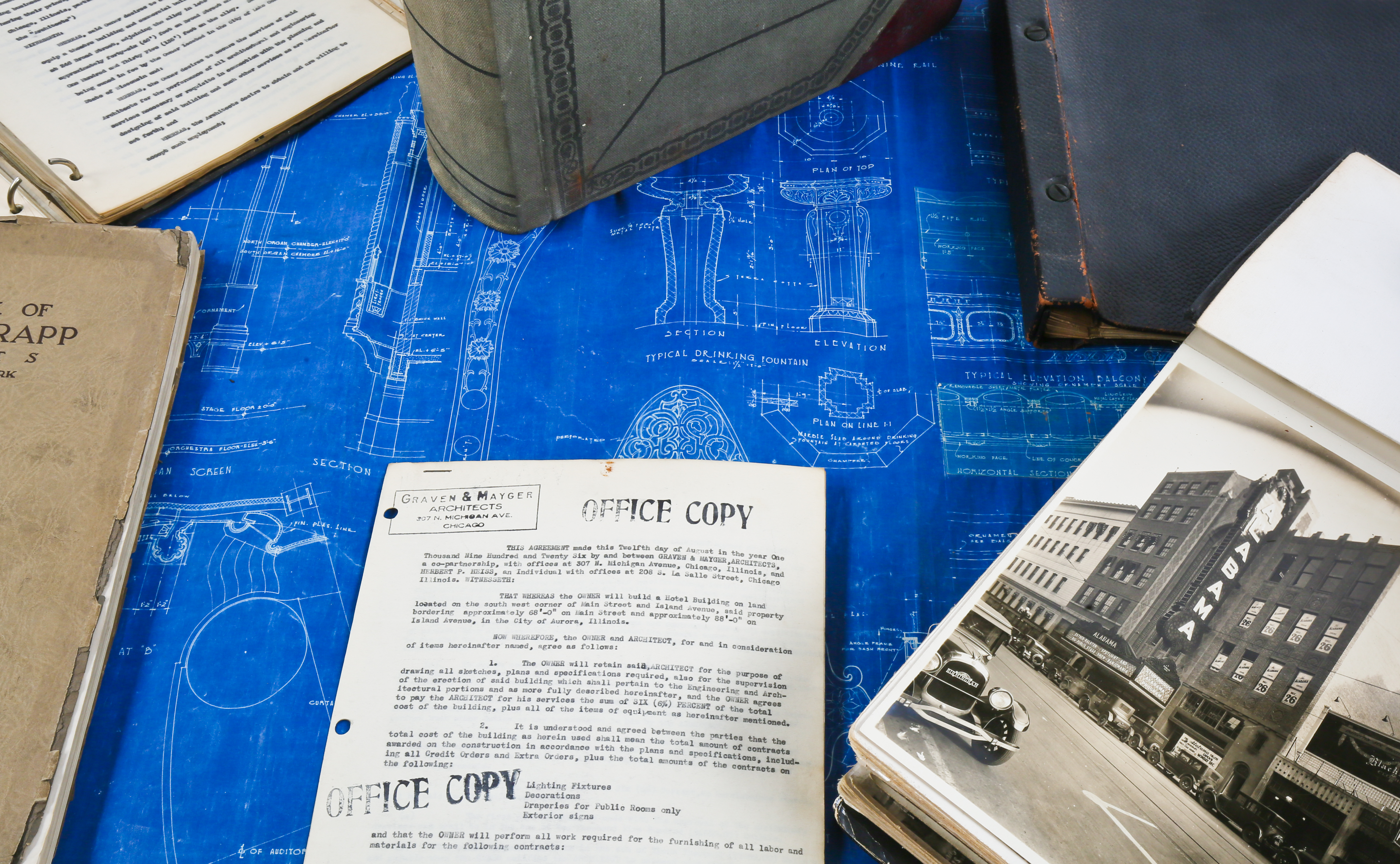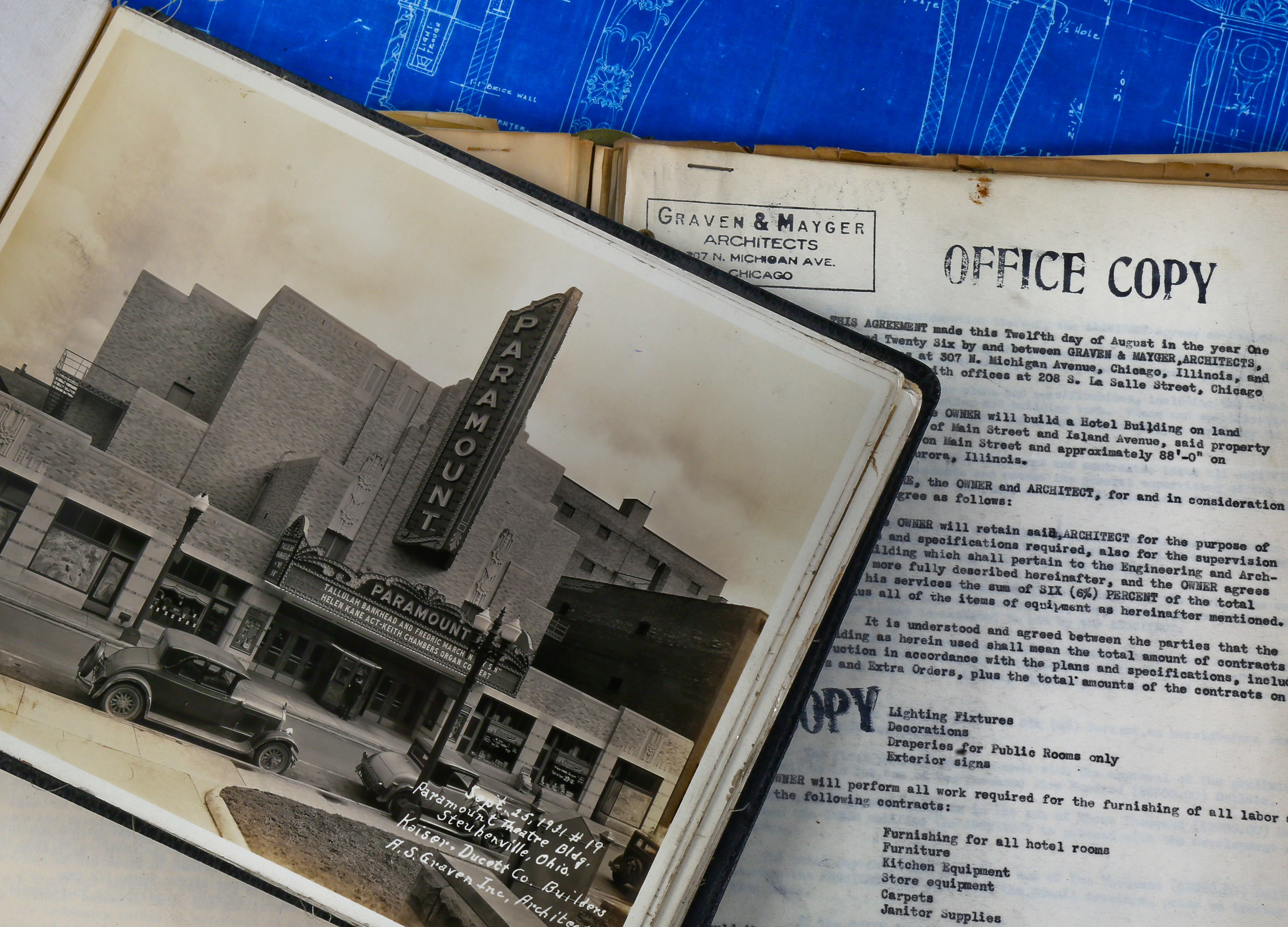 the bldg. 51 museum recently secured another important archive, containing previously undocumented materials belonging to the short-lived notable chicago-based architectural firm of graven and mayger. the drawings, ledgers, blueprints, photographs, and paperwork last belonged to edward rupinksi, who worked as a draftsman for the firm. a portion of the archive contains material from the prestigious firm of rapp and rapp, which was likely obtained during the time both anker graven and arthur mayger spent working for them. the expense sheets and contracts tied to rapp and rapp’s uptown and tivoli theaters are especially of interest. the core of the graven and mayger archive revolves around a gargantuan binder, acting as a portfolio for hundreds of silver-gelatin photographic prints. this includes most, if not all of their commissions; especially noteworthy are the extensive interior shots of several movie palaces shortly after their completion. the firm of graven and mayger split up in 1930, after the completion of a number of architecturally important theaters and buildings. from then on, the firm continued as a.s. graven, inc. architects and completed a number of subsequent commissions for paramount pictures. after graven’s passing in 1932, rupinski was left in charge of the firm’s records, and they remained in his possession until his death in 1961. discovered over fifty years later in his former residence here in chicago, little of this collection has ever been viewed by even the most prestigious architectural historians, let alone the general populace. all of the material is currently being digitized, after which it will be made available in the archive section of the bldg. 51 museum website.
