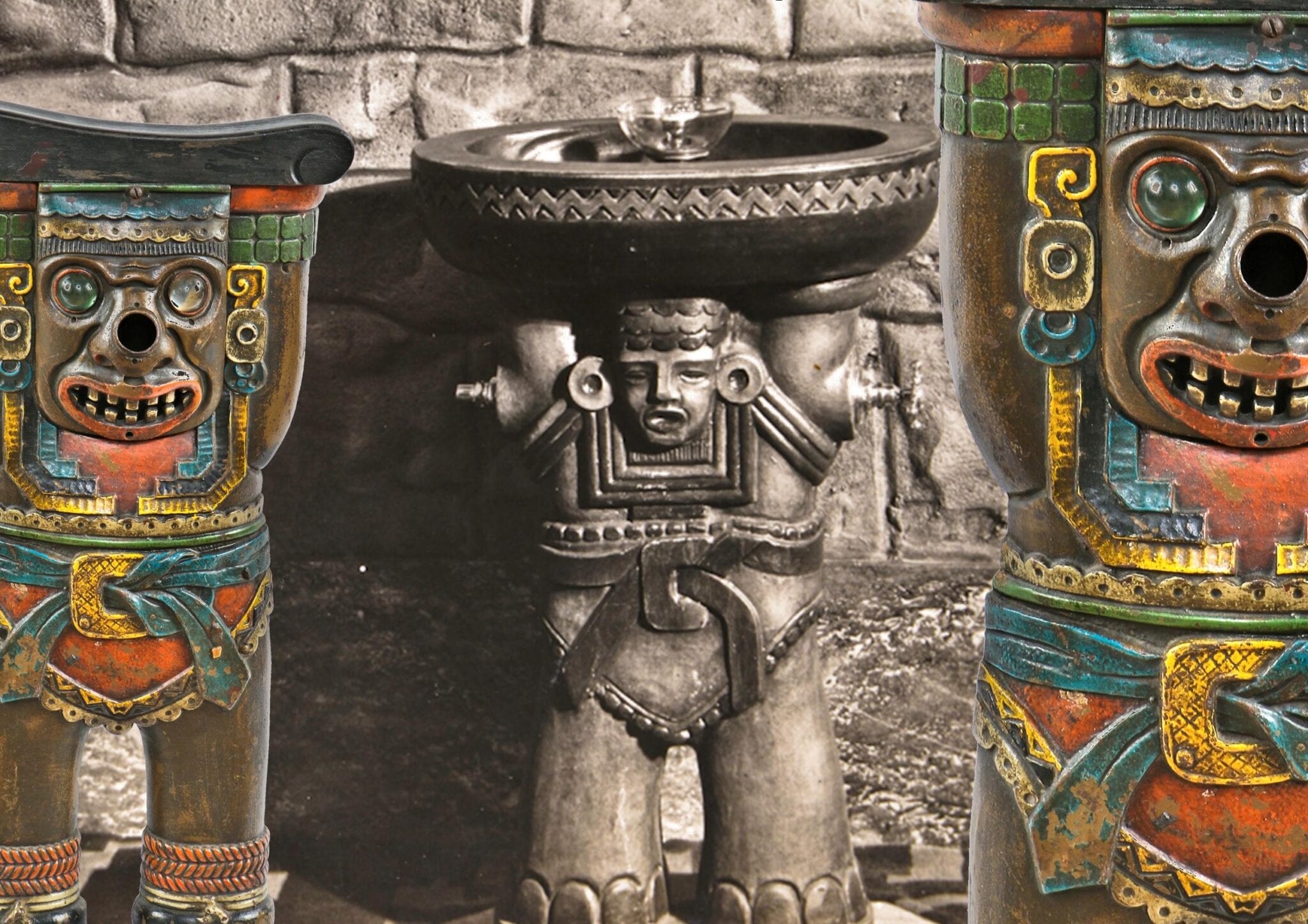 original polychromed ornamental cast iron figural fisher theater seat end with “jeweled” colored glass eyes and nose. the theater seat end was fabricated by heywood-wakefield specifically for use with the fisher theater. image courtesy of the bldg. 51 museum collection.