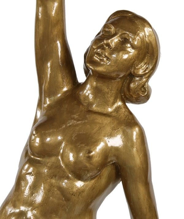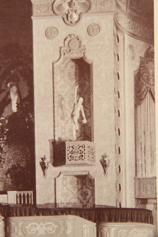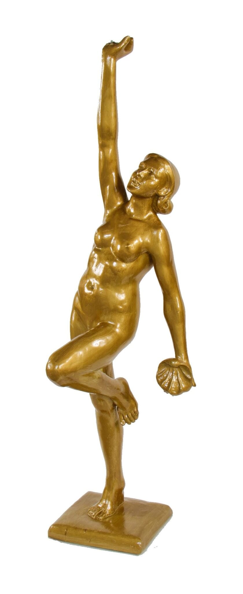 a well-documented c. 1931 american depression era interior southtown theater or movie palace auditorium alcove full-figured “flapper girl” statue to the illustrious chicago-based architectural decorating company. the finely crafted life-size nude female statue is comprised of cast plaster and reinforced with horse hair – a popular binding agent used during this period in time. the female’s striking upright pose consists of an outstretched arm, headed tilted upward, standing on a single leg and the left hand grasping a clam shell. the original square-shaped base or stand is intact and structurally sound. the statue contains a uniform metallic gold enameled finish. an identical statue was used in the lobby of the non-extant paradise theater designed in 1928 by john eberson. images of the statue as it was displayed in the southtown and paradise theaters are shown below.