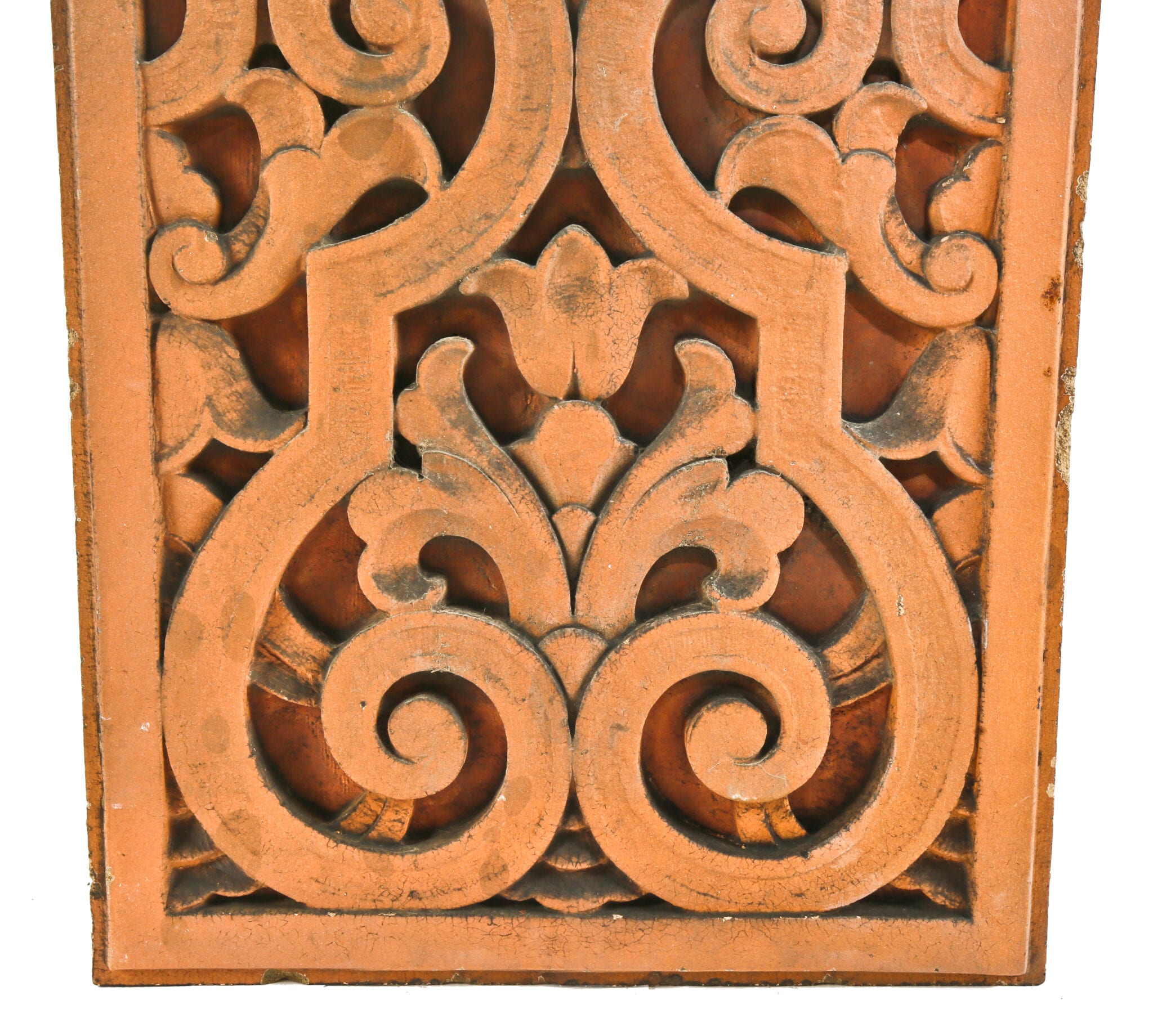 the building 51 museum and archive recently acquired an all original and historically important heavily ornamented terra cotta panel rescued from rapp and rapp’s southtown theater during its unfortunate demolition in 1991. the single-sided polychromed exterior theater panel features foliated scrollwork with centrually located petalled flower. the terra cotta block consists of a two-tone glaze, with the raised ornament finished in tan. the recessed regions contain a reddish-brown glaze with allover crazing evident. the theater’s ornamental terra cotta was fabricated by the northwestern terra cotta company, chicago, ills.