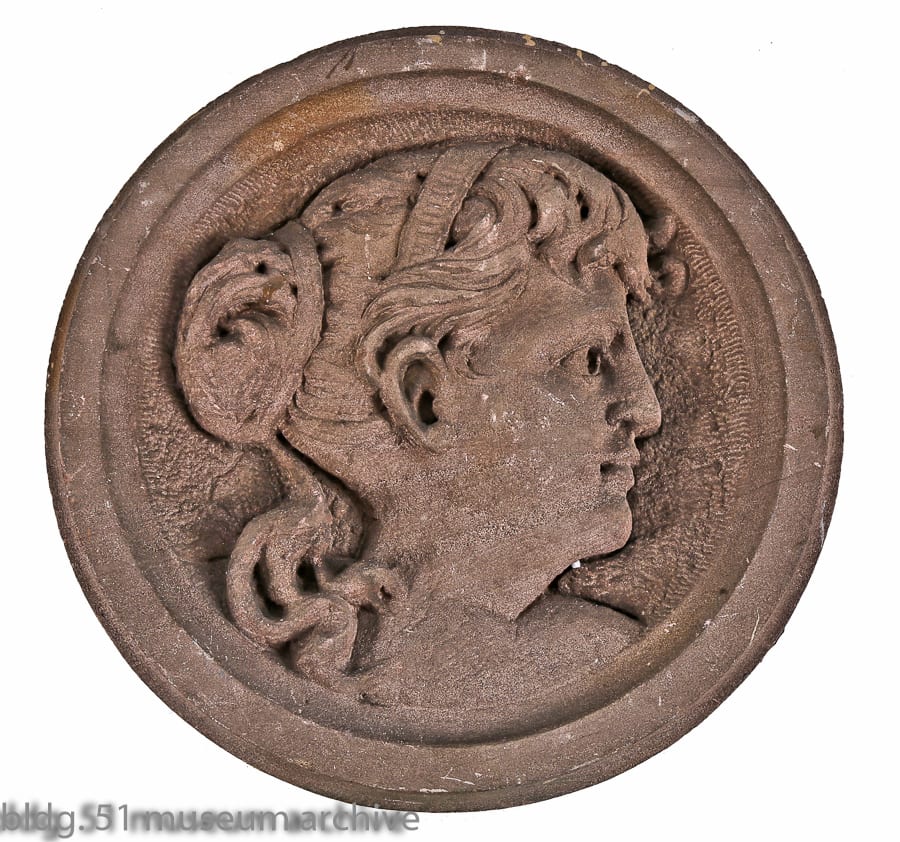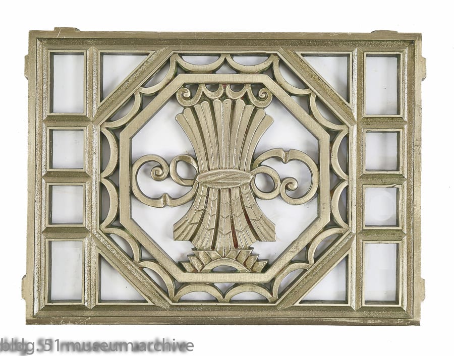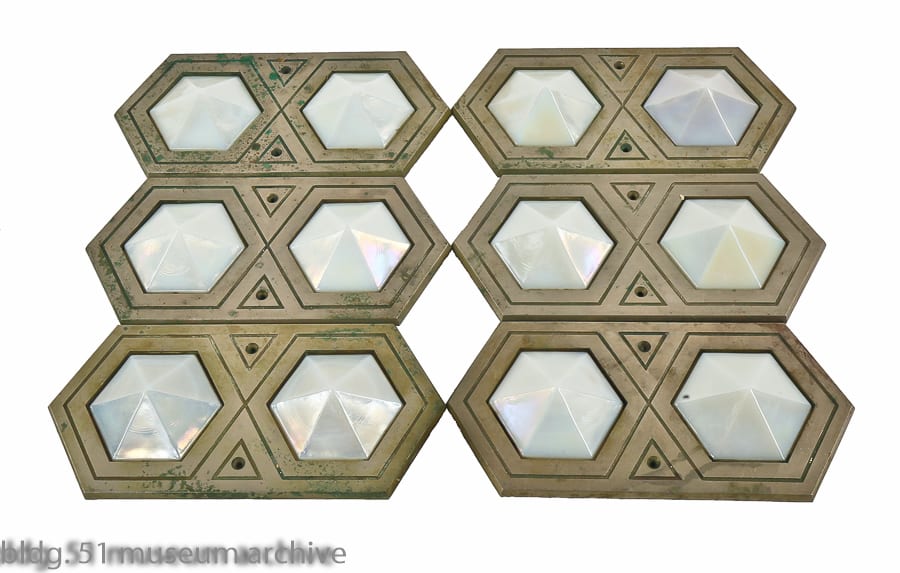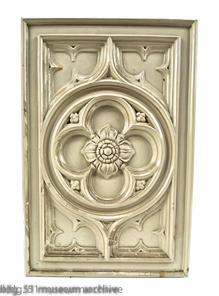 09 Aug art deco slip shade fixtures, vintage examination room furniture, palmolive building elevator indicators, majolica tiles, and figural brownstone rondels