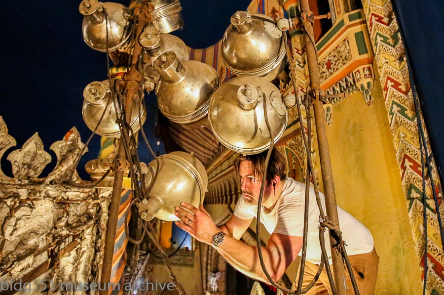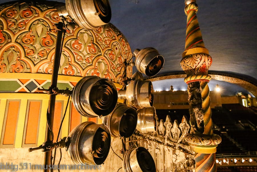 i spent the remainder of my time inside the auditorium, recording the original major equipment company spotlights, cove lighting, multi-colored lenses and any other lighting equipment installed around the time the theater was completed in 1927. i was pleasantly surprised that the lighting system remained largely intact (this includes the electric “stars” embedded in the ceiling’s sky and undisturbed by renovations. most of the equipment was found deeply entrenched in and around the side-wall plaster scenery.