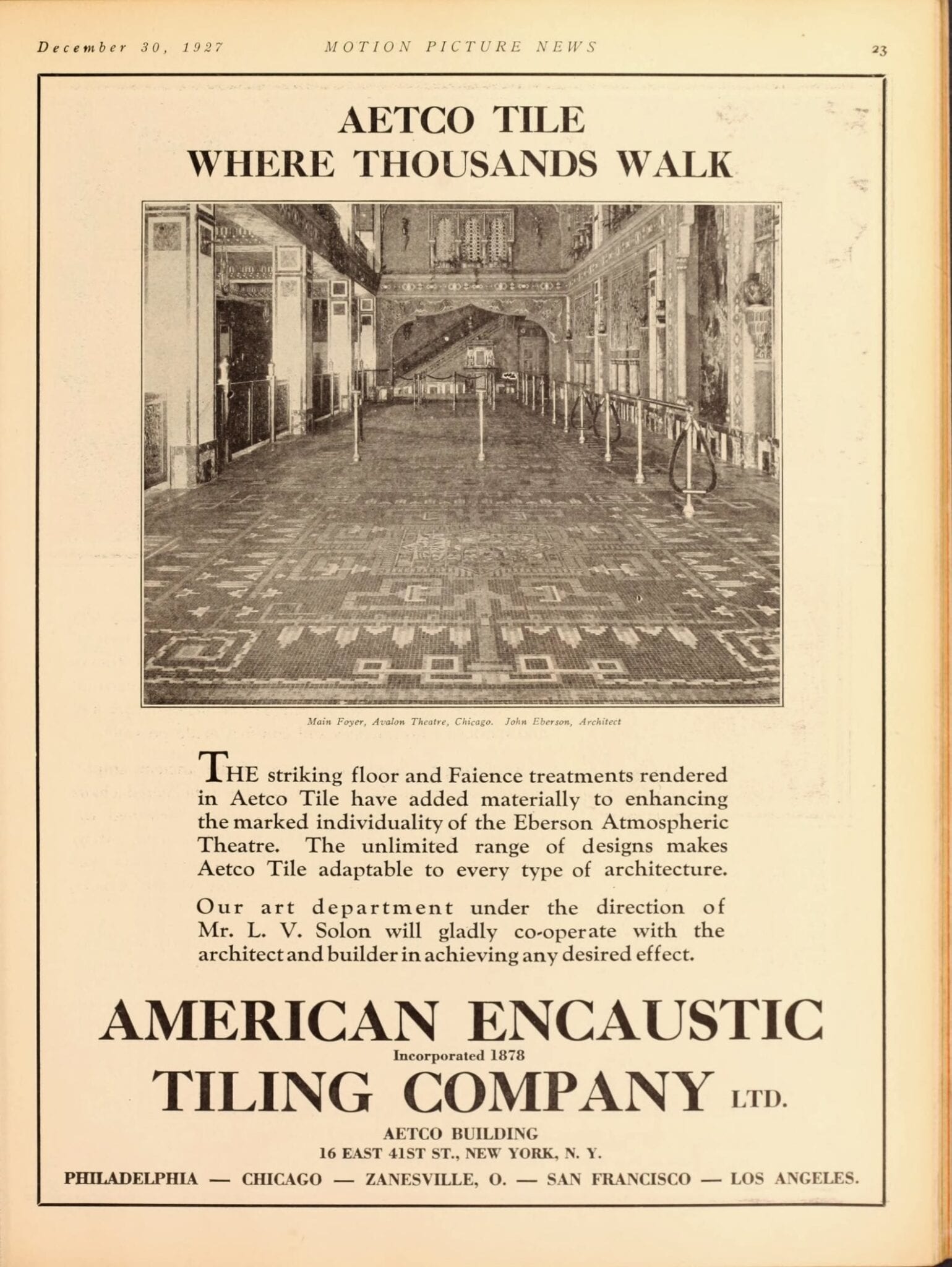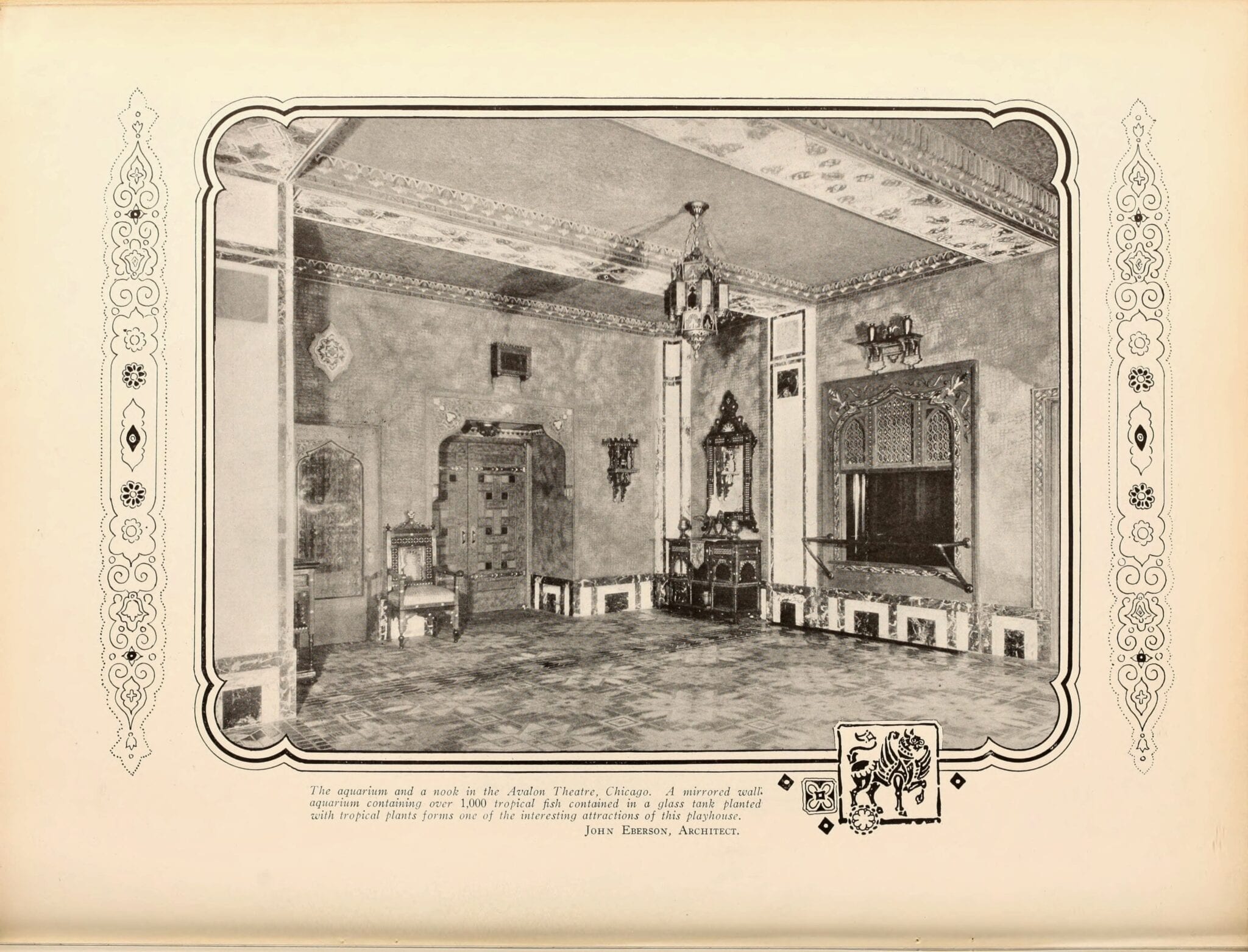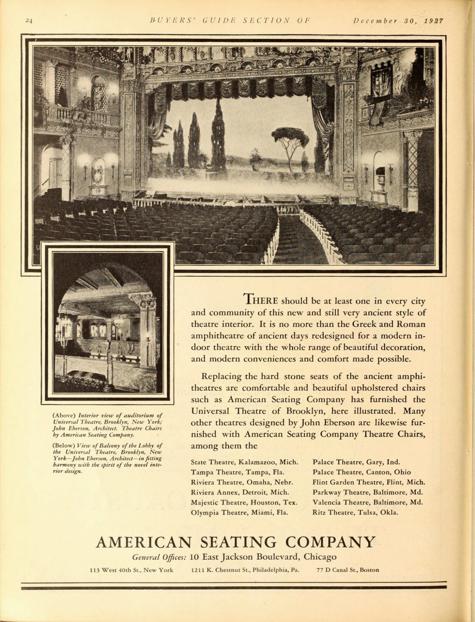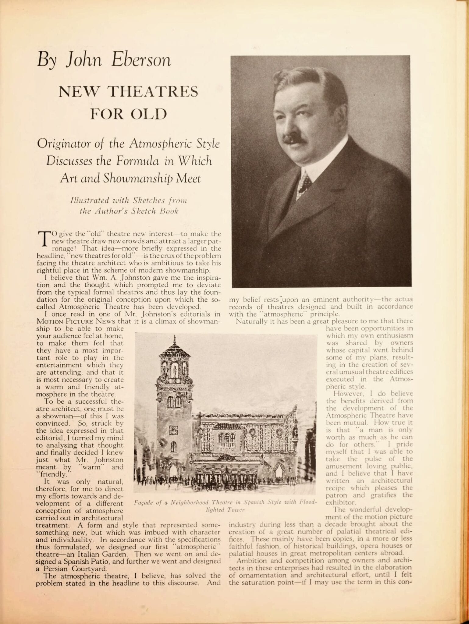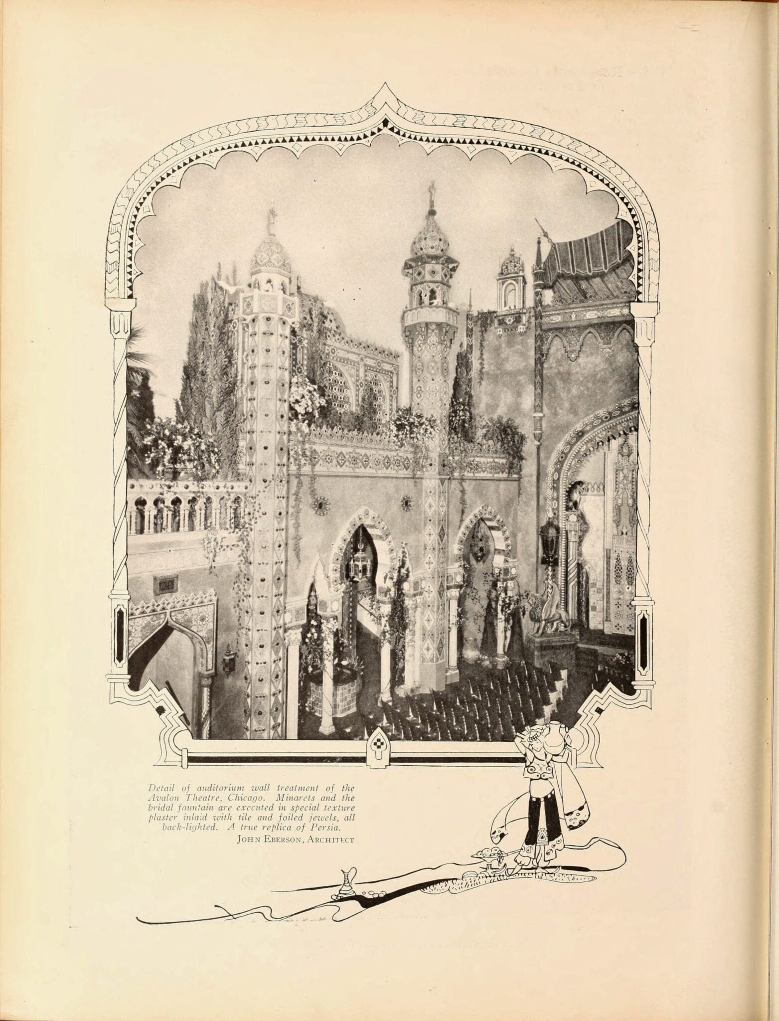 pages from a digitized period magazine highlighting john eberson’s atmospheric theaters with emphasis on the avalon and the companies involved in supplying materials.