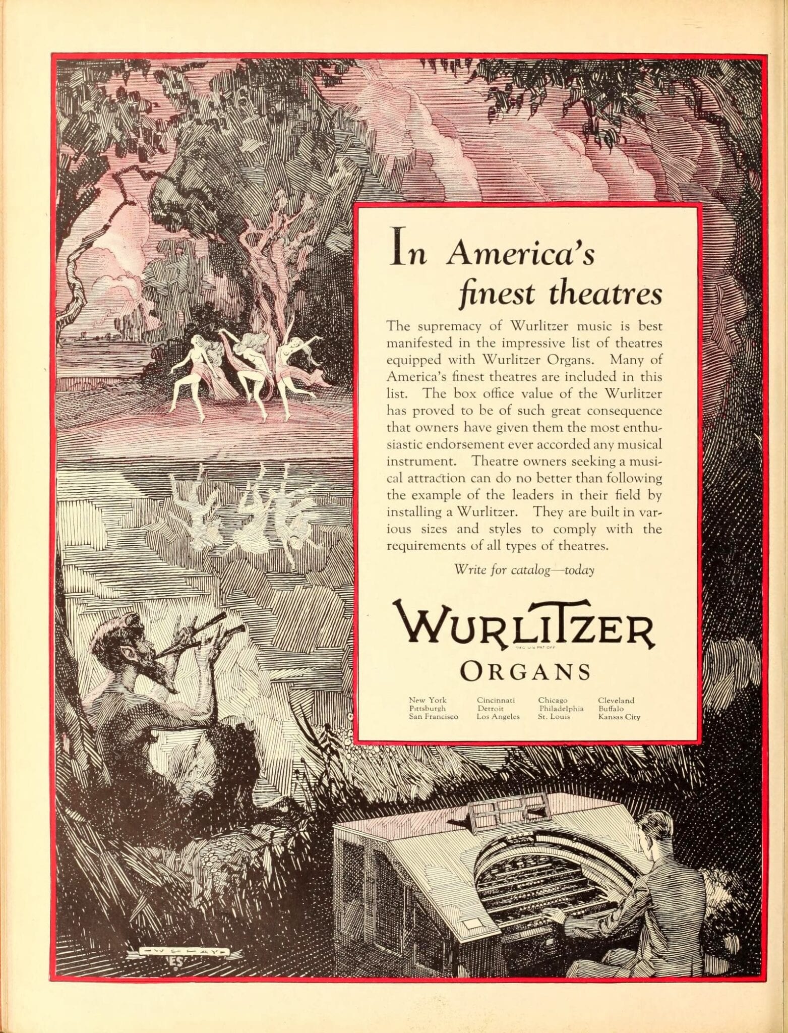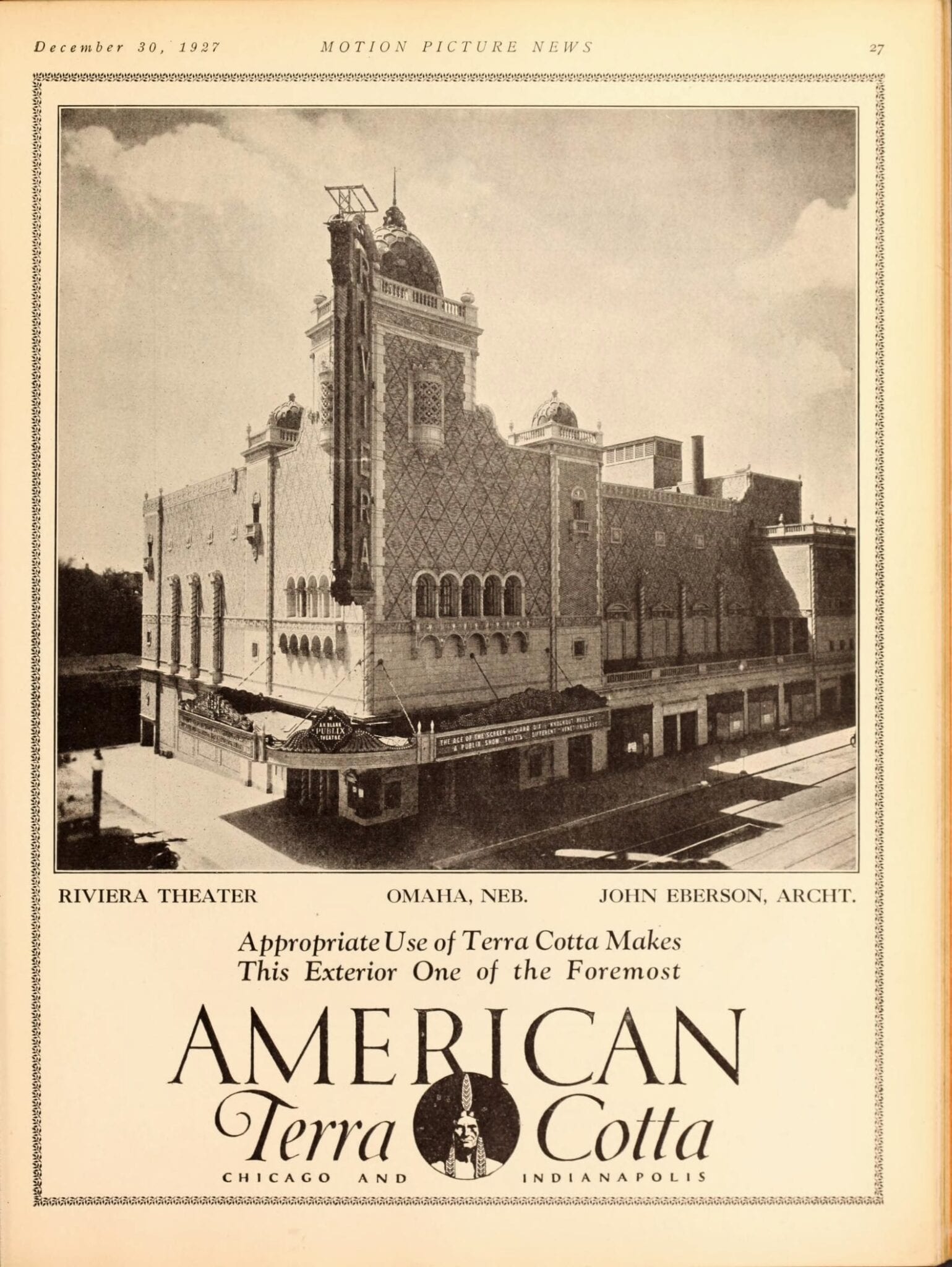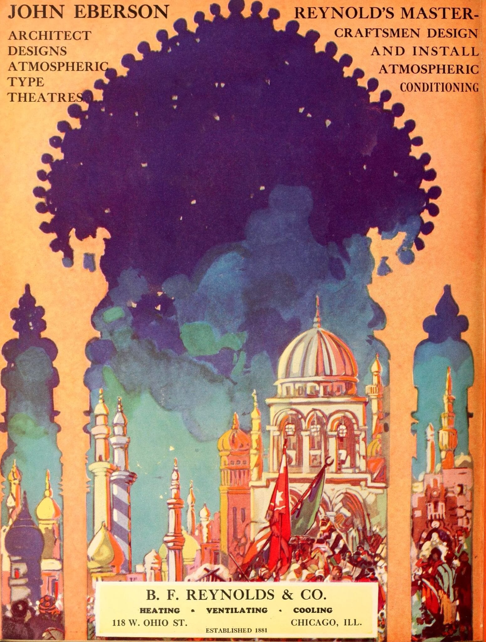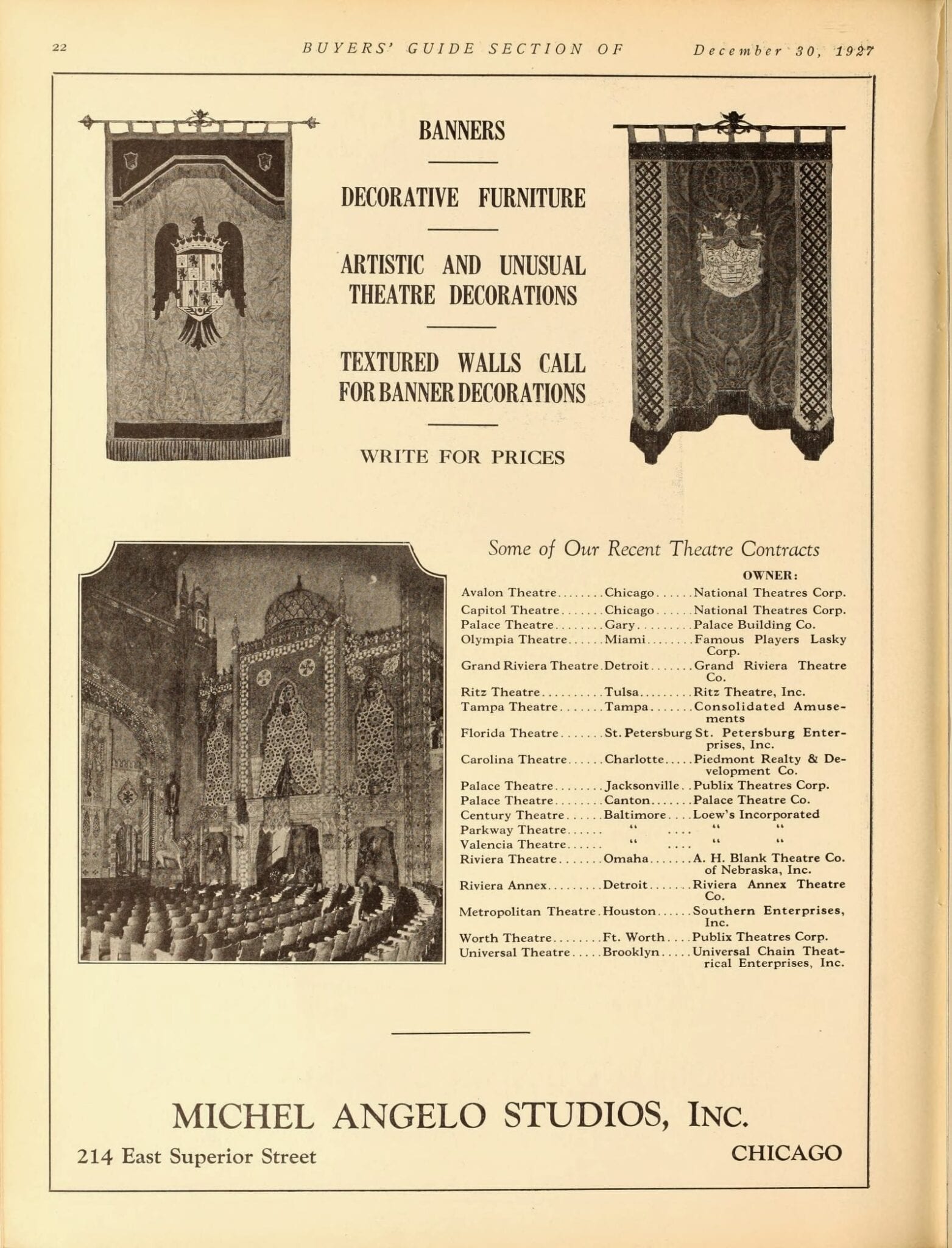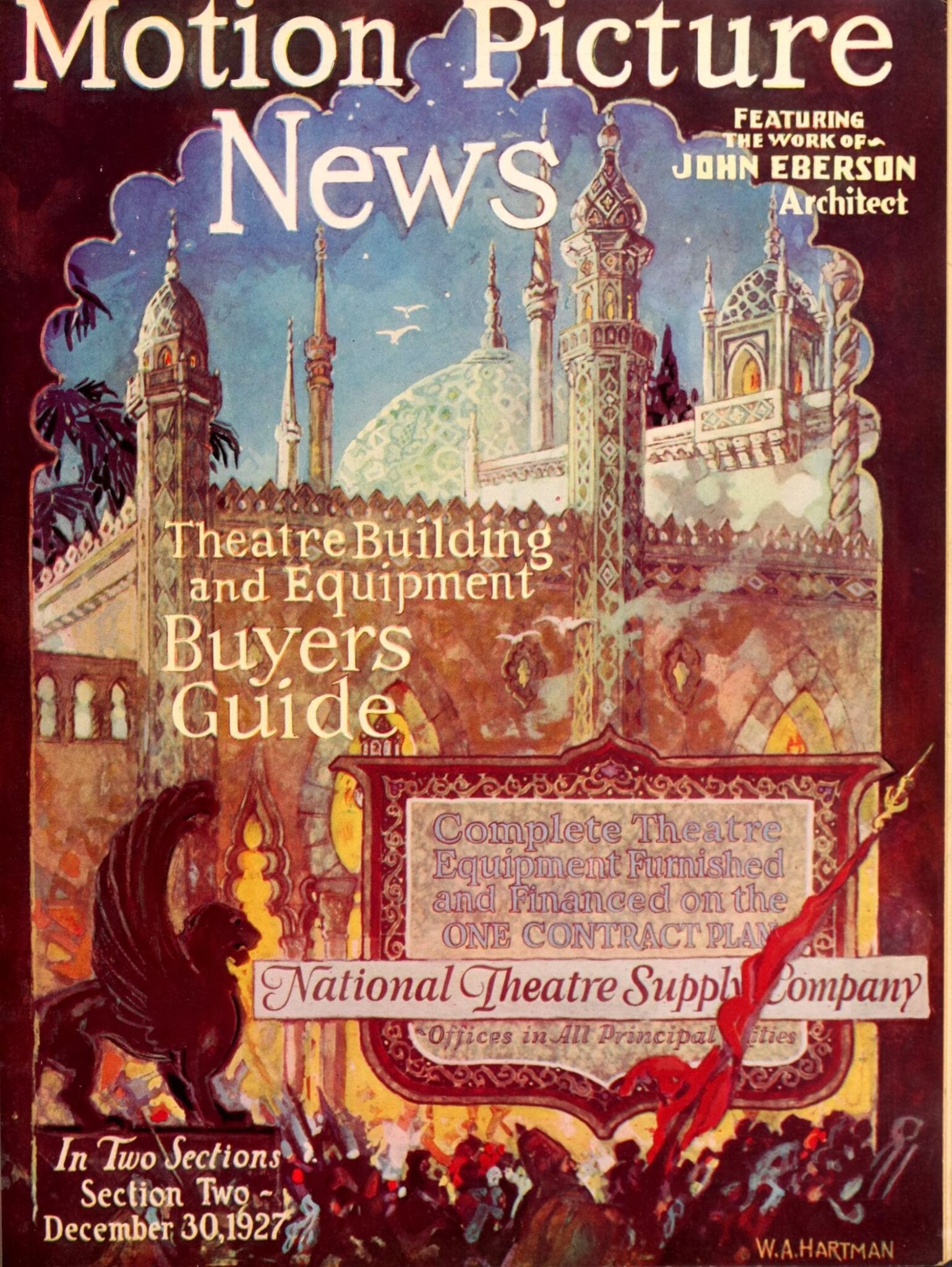 pages from a digitized period magazine highlighting john eberson’s atmospheric theaters with emphasis on the avalon and the companies involved in supplying materials.